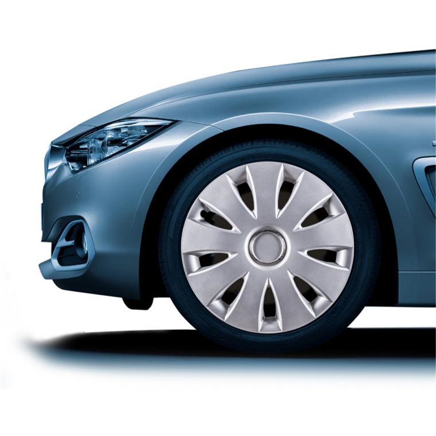 Set 4 copricerchi universali in abs antiurto di altissima qualità. Sistema di montaggio ultrarapido a pressione con anello metallico. Made in Europe. Per cerchi da 15".