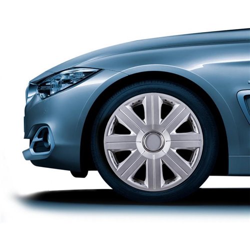 Set 4 copricerchi universali in abs antiurto di altissima qualità. Sistema di montaggio ultrarapido a pressione con anello metallico. Made in Europe. Per cerchi da 15".