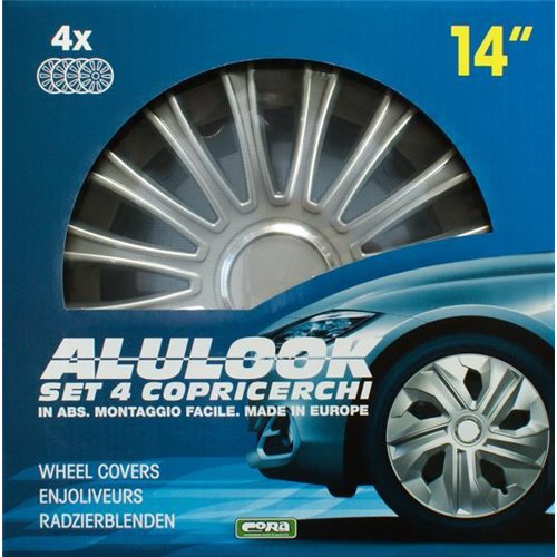 Set 4 copricerchi universali in abs antiurto di altissima qualità. Sistema di montaggio ultrarapido a pressione con anello metallico. Made in Europe. Per cerchi da 14".