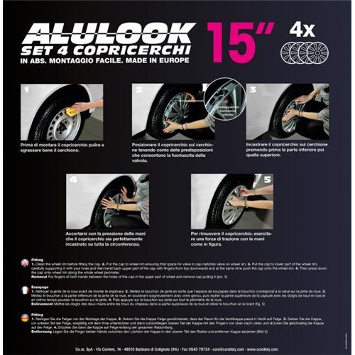 Set 4 copricerchi universali in abs antiurto di altissima qualità. Sistema di montaggio ultrarapido a pressione con anello metallico. Made in Europe. Per cerchi da 16".