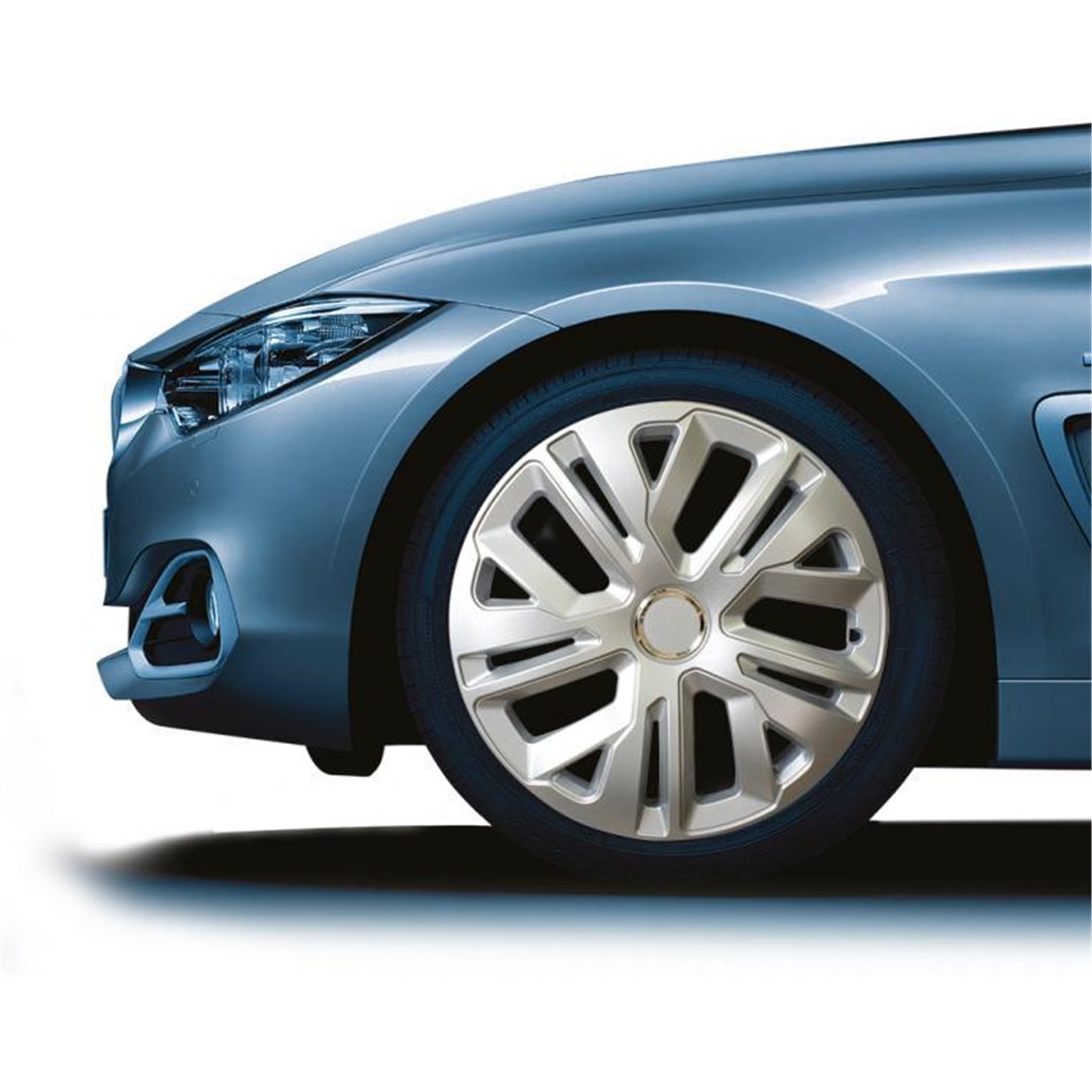 Set 4 copricerchi universali in abs antiurto di altissima qualità. Sistema di montaggio ultrarapido a pressione con anello metallico. Made in Europe. Per cerchi da 15".