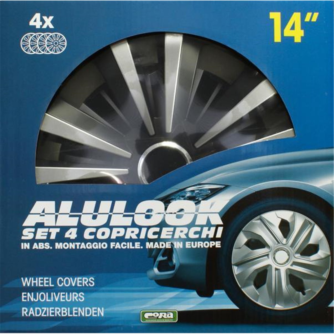 Set 4 copricerchi universali in abs antiurto di altissima qualità. Sistema di montaggio ultrarapido a pressione con anello metallico. Made in Europe. Per cerchi da 14".