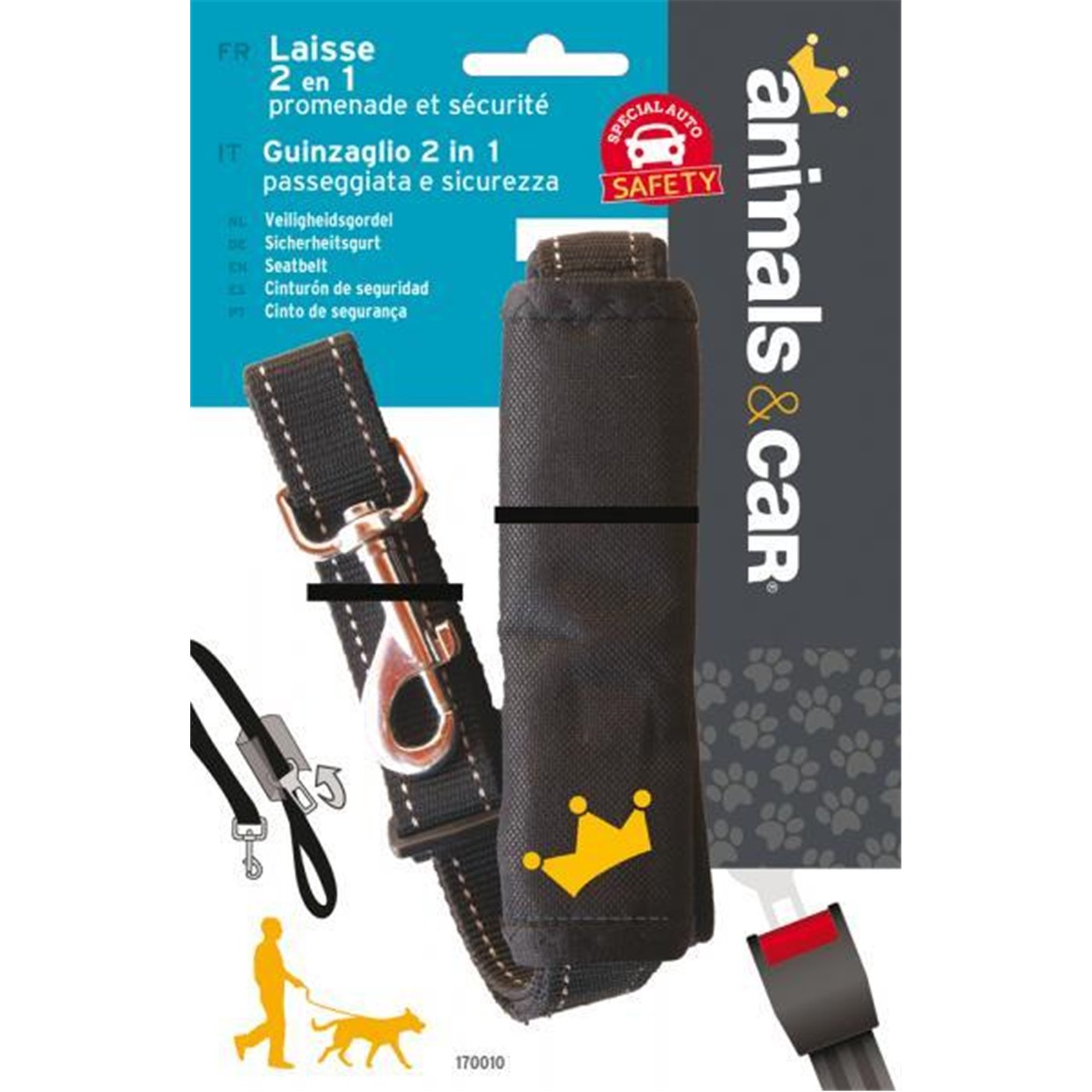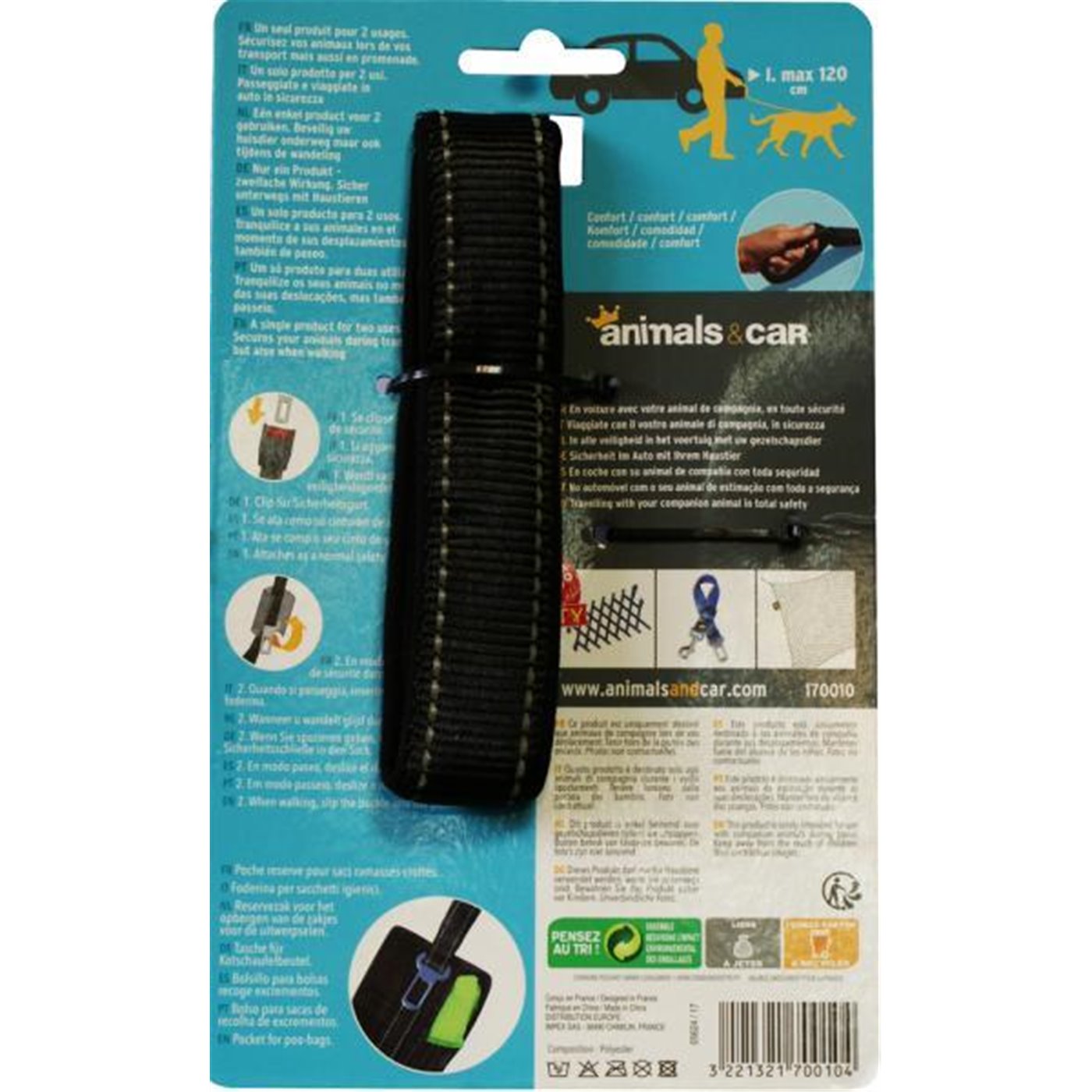 Guinzaglio da passeggio che in auto si aggancia alla fibbia delle cinture di sicurezza posteriori ed impedisce che l’animale possa spostarsi nei sedili anteriori. Il gancio rapido durante le passeggiate si può inserire nella manopola in spugna. Con fodera porta sacchetti igienici. Lunghezza regolabile da 0,7 a 1,2 m. In poliestere.