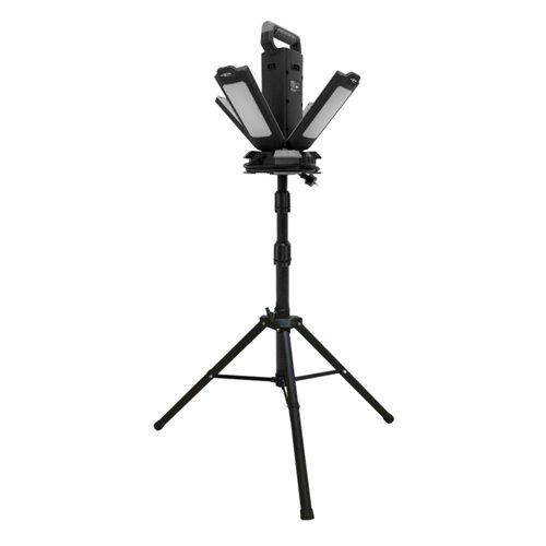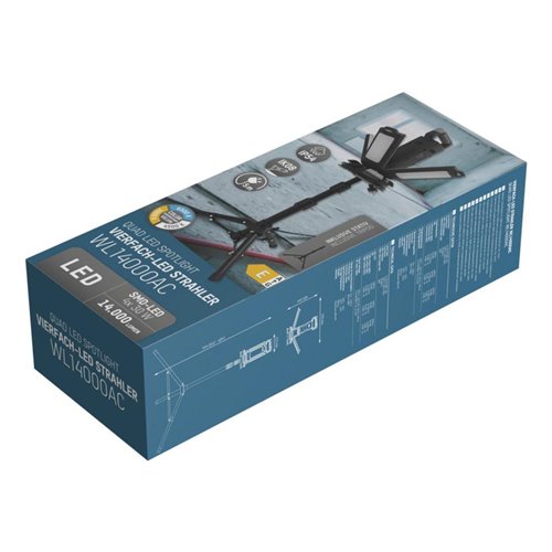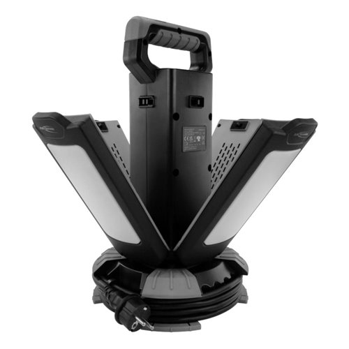 Faretto da lavoro professionale con 4 spot. Potenza 120 watt e luminosità fino a 13.700 lumen. Tre livelli di luminosità e temperature di colore selezionabili (100% / 50% / 25% - 3000 K / 4500 K / 6500 K). Illuminazione omogenea ideale per lavorare sia all’interno che all’esterno. Molto compatto da trasportare grazie ai piedini pieghevoli e al supporto regolabile in altezza fino a circa 200 cm. Classi di protezione: IK08, IP54. Alimentazione: 230V. Incluso dispositivo avvolgicavo. Dimensioni prodotto/peso 545 × 465 × 442 mm / 8,7 kg.