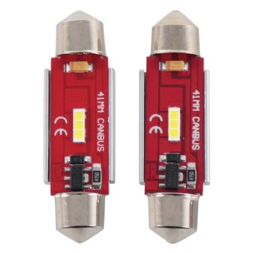 Coppia lampadine C5W 12-24V 6W con 1 led 1860. Luce bianchissima grazie all'elevata temperatura di colore (6000K). Attacco T11. Lunghezza 41 mm. Con Canbus testati.