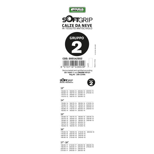 Calze da neve realizzate in tessuto antiscivolo, leggero e resistente. Indicate per l’utilizzo in emergenza su strade innevate, per distanze brevi e ad una velocità massima di 50 km/h. Veloci e semplici da montare, assicurano una guida silenziosa e senza vibrazioni. Adatte per veicoli con passaruota ridotti grazie all'ingombro interno di soli 7 mm. Compatibili solo con veicoli dotati di ABS. Confezionate a coppie in pratica borsa con zip e manico. Un paio di guanti inclusi. Omologate secondo la normativa europea EN16662-1 per le categorie di veicoli M1, N1, O1, O2 (veicoli con almeno quattro ruote, progettati e costruiti per il trasporto di persone, aventi al massimo otto posti a sedere oltre al sedile del conducente - veicoli progettati e costruiti per il trasporto di cose, aventi massa massima non superiore a 3,5 t - rimorchi con massa massima non superiore a 3,5 t).