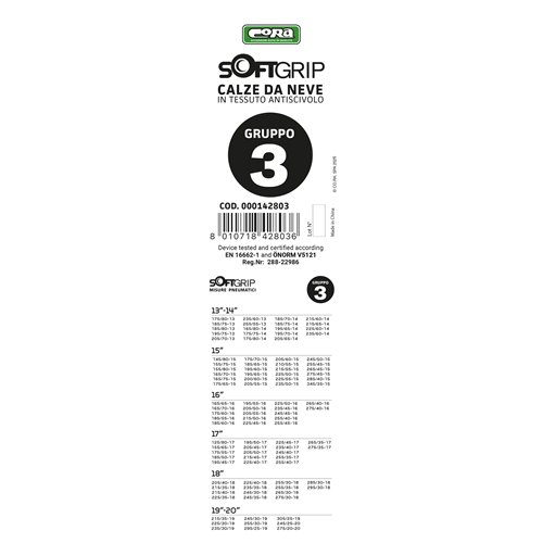 Calze da neve realizzate in tessuto antiscivolo, leggero e resistente. Indicate per l’utilizzo in emergenza su strade innevate, per distanze brevi e ad una velocità massima di 50 km/h. Veloci e semplici da montare, assicurano una guida silenziosa e senza vibrazioni. Adatte per veicoli con passaruota ridotti grazie all'ingombro interno di soli 7 mm. Compatibili solo con veicoli dotati di ABS. Confezionate a coppie in pratica borsa con zip e manico. Un paio di guanti inclusi. Omologate secondo la normativa europea EN16662-1 per le categorie di veicoli M1, N1, O1, O2 (veicoli con almeno quattro ruote, progettati e costruiti per il trasporto di persone, aventi al massimo otto posti a sedere oltre al sedile del conducente - veicoli progettati e costruiti per il trasporto di cose, aventi massa massima non superiore a 3,5 t - rimorchi con massa massima non superiore a 3,5 t).
