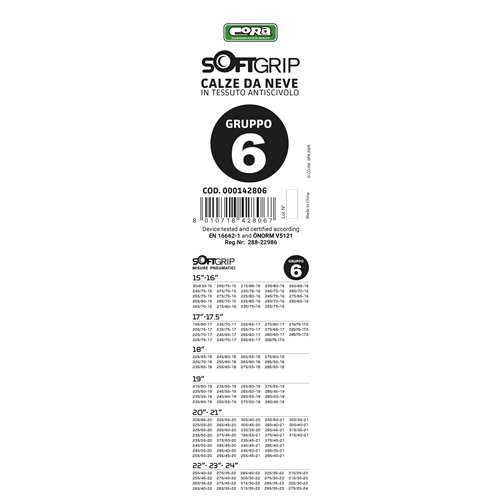 Calze da neve realizzate in tessuto antiscivolo, leggero e resistente. Indicate per l’utilizzo in emergenza su strade innevate, per distanze brevi e ad una velocità massima di 50 km/h. Veloci e semplici da montare, assicurano una guida silenziosa e senza vibrazioni. Adatte per veicoli con passaruota ridotti grazie all'ingombro interno di soli 7 mm. Compatibili solo con veicoli dotati di ABS. Confezionate a coppie in pratica borsa con zip e manico. Un paio di guanti inclusi. Omologate secondo la normativa europea EN16662-1 per le categorie di veicoli M1, N1, O1, O2 (veicoli con almeno quattro ruote, progettati e costruiti per il trasporto di persone, aventi al massimo otto posti a sedere oltre al sedile del conducente - veicoli progettati e costruiti per il trasporto di cose, aventi massa massima non superiore a 3,5 t - rimorchi con massa massima non superiore a 3,5 t).
