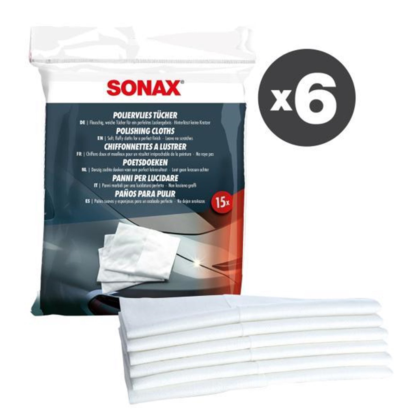 Panno ideale per trattare la vernice dell’auto. Grazie alla struttura del tessuto, i prodotti vengono distribuiti equilibratamente sulla superficie da lucidare. Delicato sulla vernice e non lascia graffi. Anche se usato con solventi non perde le sue eccezionali qualità. Confezione da 6 buste da 15 panni ciascuna.