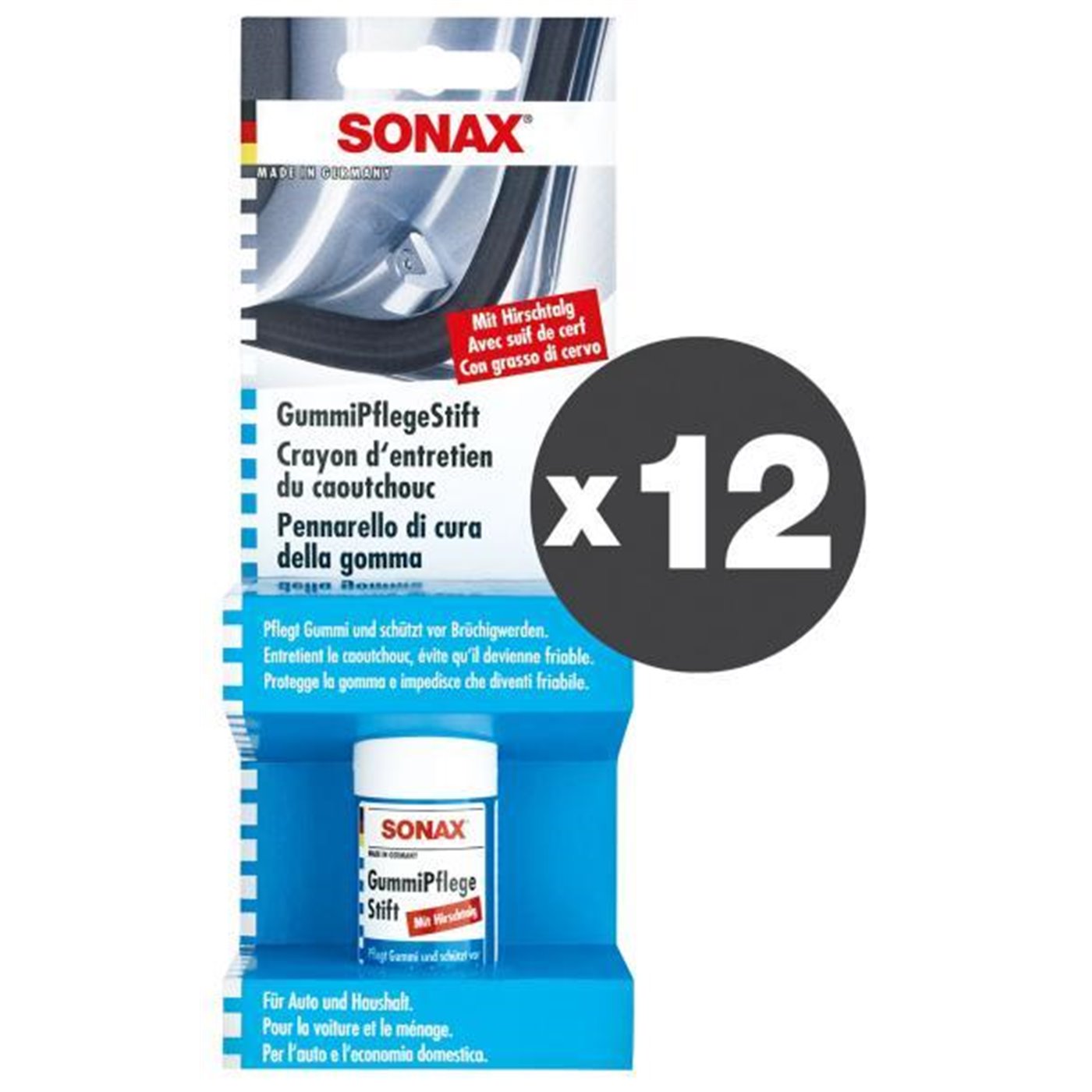 Pennarello contenente vasellina e grasso di cervo, appositamente studiato per mantenere la gomma elastica proteggendola dalle screpolature. In inverno impedisce che le guarnizioni in gomma si incollino su porte, vetri e portelloni di chiusura del bagagliaio. Adatto sia per l’automobile che la casa. Confezione da 12 cartucce da 20 g.