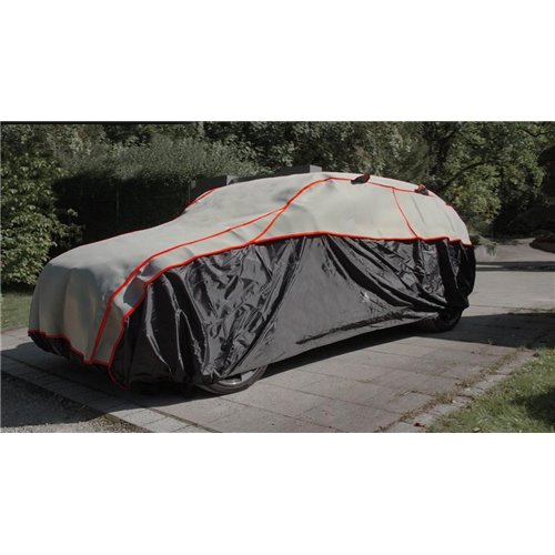 Copriauto antigrandine realizzato in materiale idrorepellente, con rivestimento interno in TNT a protezione della vernice ed imbottitura in neoprene da 4,5 mm nelle zone maggiormente esposte ai danni ovvero cofano/tetto/bagagliaio. Garantito contro grandine fino a 11 mm di diametro e con una velocità di caduta fino a 70 km/h. Provvisto di aperture di ventilazione per permettere un buon passaggio dell'aria ed evitare la formazione di condensa. Con elementi catarifrangenti sulla parte esterna e fasce perimetrali ultra arancioni per una migliore visibilità dell'auto. Estremamente semplice da montare su ogni tipo di SUV grazie alle cuciture elastiche e ad altri specifici accorgimenti. Misure: 430 (lunghezza) x 165 (larghezza) x 145 (altezza) cm.