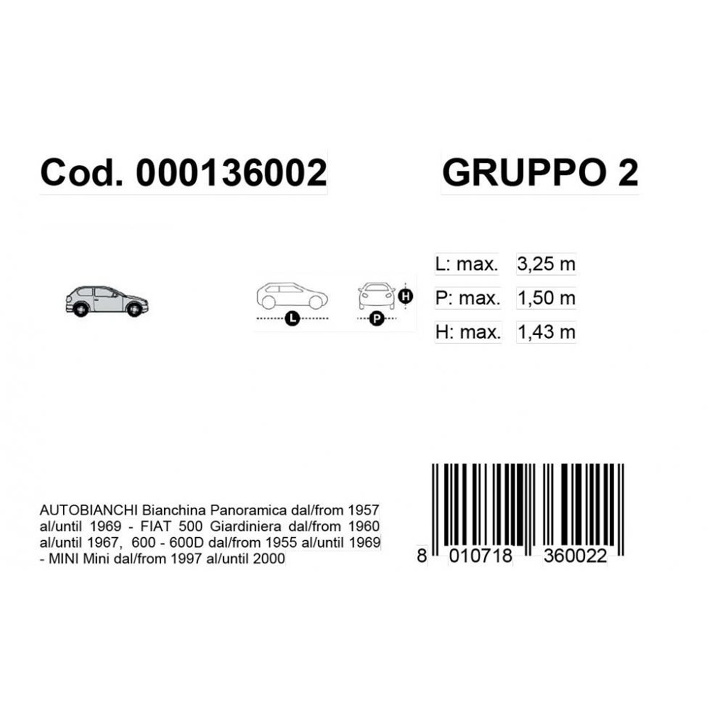 Copriauto di alta qualità ideale per proteggere l'auto da tutti gli agenti atmosferici. Realizzato in PVC grigio accoppiato con tessuto non tessuto. Totalmente impermeabile perchè elettrosaldato. Provvisto di aeratori anticondensa e di anelli di ancoraggio posti sul bordo inferiore. Lavabile a mano. Assicurato. Dimensioni (lungh. x largh. x alt.): 325 x 150 x 143 cm.