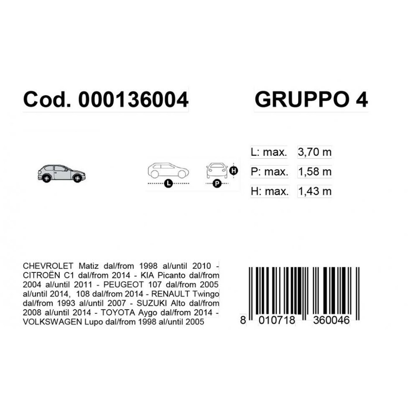 Copriauto di alta qualità ideale per proteggere l'auto da tutti gli agenti atmosferici. Realizzato in PVC grigio accoppiato con tessuto non tessuto. Totalmente impermeabile perchè elettrosaldato. Provvisto di aeratori anticondensa e di anelli di ancoraggio posti sul bordo inferiore. Lavabile a mano. Assicurato. Dimensioni (lungh. x largh. x alt.): 370 x 158 x 143 cm.
