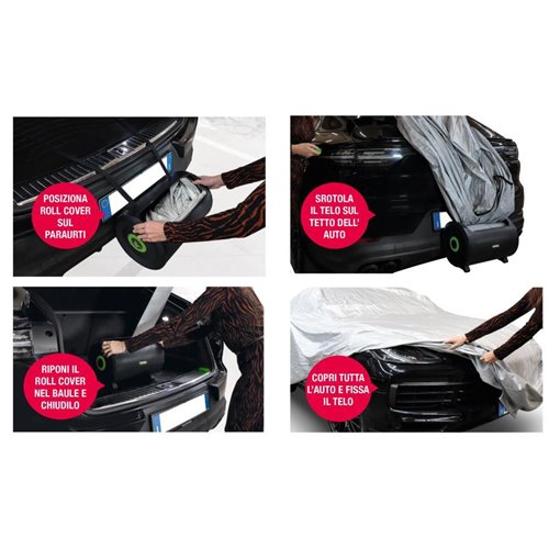 Copriauto elettrico e automatico con batteria ricaricabile. Grazie al telecomando si srotola e si arrotola da solo per un montaggio/smontaggio semplice e veloce in pochi minuti ed in totale comodità. Protegge la carrozzeria da graffi e danni oltre che da gelo, agenti atmosferici, pioggia acida ed escrementi. Grazie al minimo ingombro (dimensioni contenitore 42x30x30 cm) si può tenere direttamente nel bagagliaio dell'auto. Ideale per auto 2 volumi, monovolume, SUV e 4x4. Lunghezza: 390 cm.