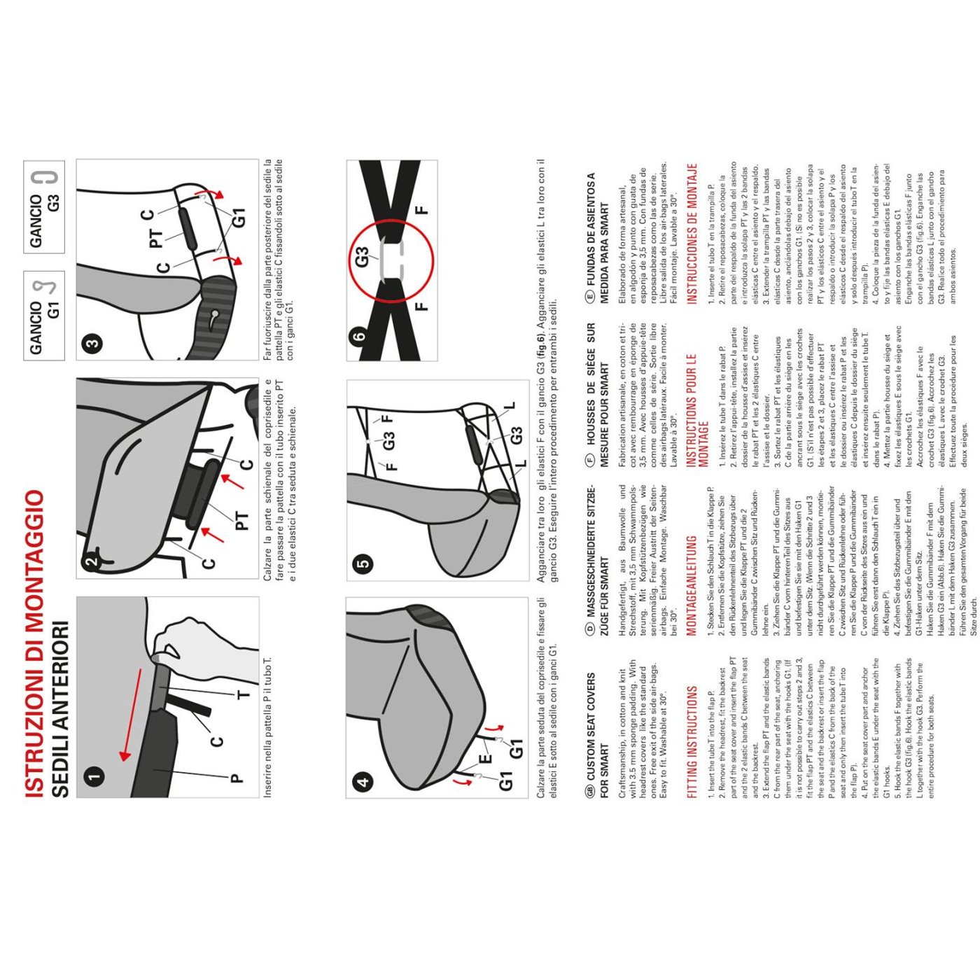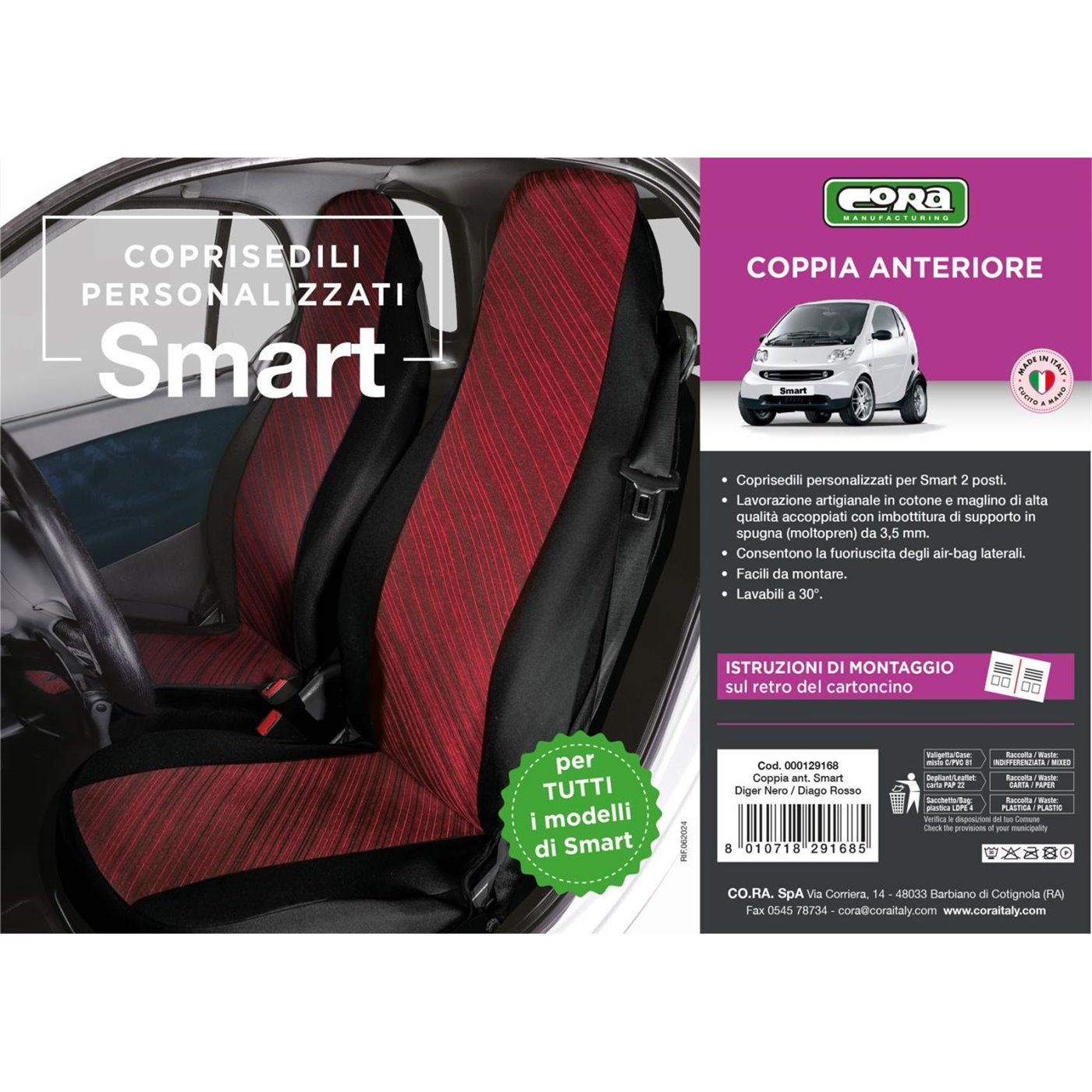 Coppia coprisedili anteriori realizzati su misura per Smart Fortwo 98>07, 07>14, 14>. In cotone e maglino di alta qualità accoppiati con imbottitura in spugna (moltopren) da 3,5 mm. Facili da montare, consentono la fuoriuscita degli airbag laterali. Prodotti in Italia con tessuti italiani. Lavabili a 30°.