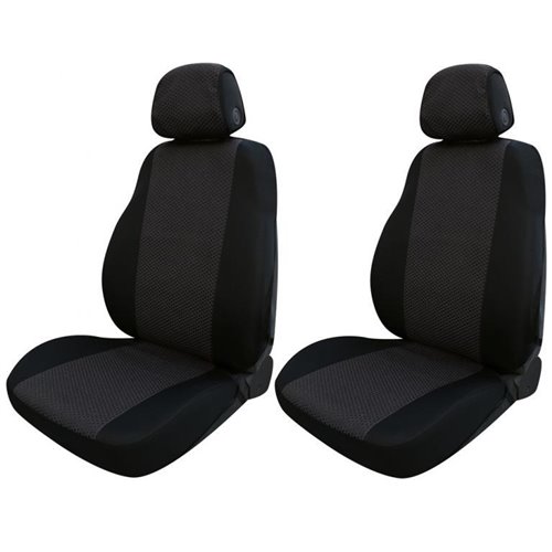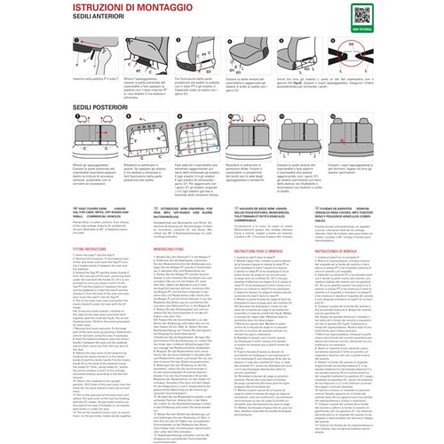 Serie completa coprisedili anteriori e posteriori in cotone e maglino di alta qualità accoppiati con imbottitura in spugna da 3,5 mm. Compatibili con tutti i sedili aventi lo schienale di altezza max 62 cm e la parte alta di larghezza 44-48 cm. Consentono la fuoriuscita degli airbag laterali. Coprisedili posteriori composti da: coprischienale provvisto di 3 cerniere (che consentono l'apertura nelle combinazioni 1/3, 1/2 e 2/3) e copriseduta intero. 5 copri appoggiatesta in dotazione. Prodotti in Italia con tessuti italiani. Facili da montare, lavabili a 30°.