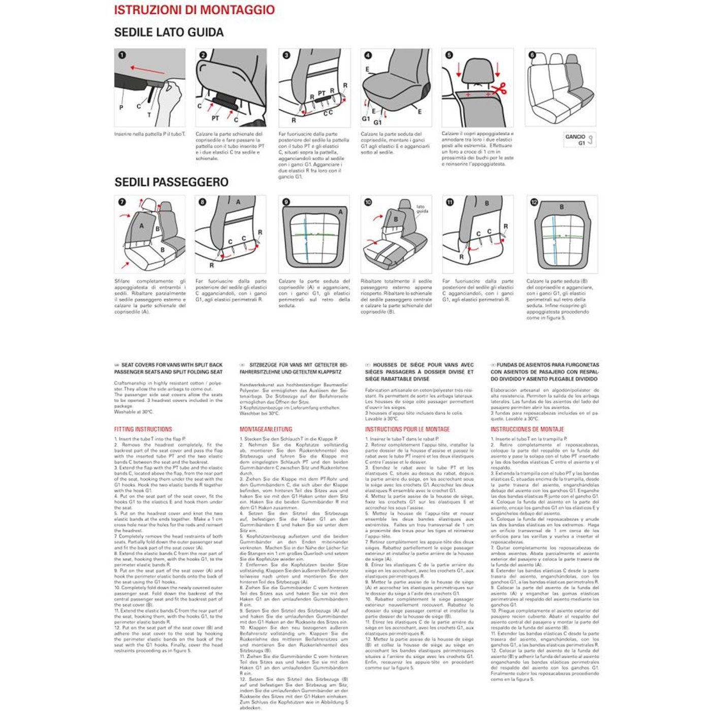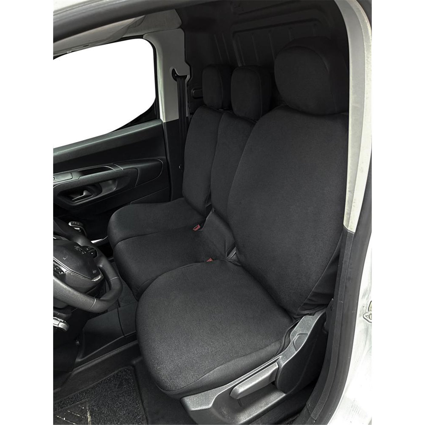 Coprisedili anteriori in poliestere altamente resistente, per furgoni con sedili passeggeri aventi schienale e seduta divisi. Compatibili con: CITROEN Berlingo van 18>, FIAT Doblò Cargo 22>, OPEL Combo cargo 18>, PEUGEOT Partner 18> 3 posti, TOYOTA ProAce City van 19>. Set composto da coprisedile anteriore lato guida + 2 coprisedili anteriori lato passeggero + 3 copri appoggiatesta. I coprisedili lato passeggeri permettono l'apertura delle sedute. Consentono la fuoriuscita degli airbag laterali. Facili da montare e lavabili a 30°. Prodotti in Italia con tessuti italiani.