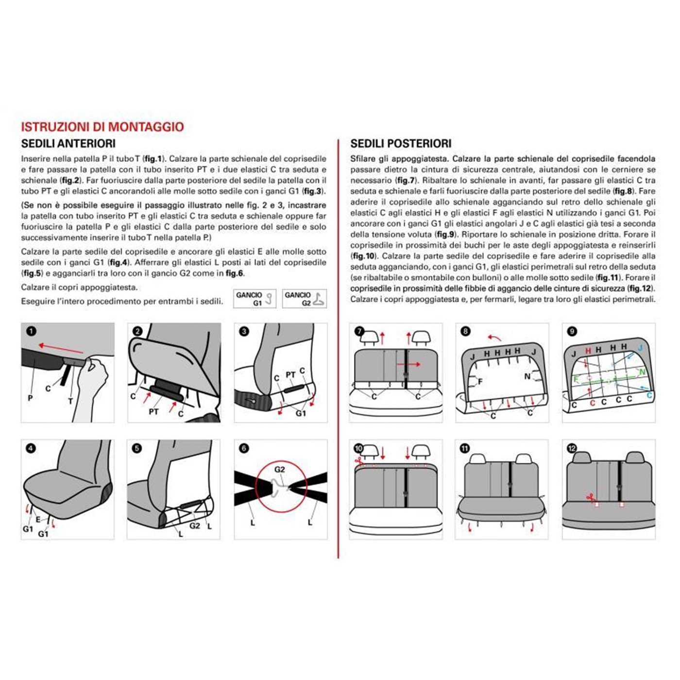 Serie completa coprisedili anteriori e posteriori in cotone e maglino di alta qualità accoppiati con imbottitura in spugna da 3,5 mm. Compatibili con tutti i sedili aventi lo schienale di altezza max 62 cm e la parte alta di larghezza 44-48 cm. Consentono la fuoriuscita degli airbag laterali. Coprisedili posteriori composti da: coprischienale provvisto di 3 cerniere (che consentono l'apertura nelle combinazioni 1/3, 1/2 e 2/3) e copriseduta intero. 5 copri appoggiatesta in dotazione. Prodotti in Italia con tessuti italiani. Facili da montare, lavabili a 30°.