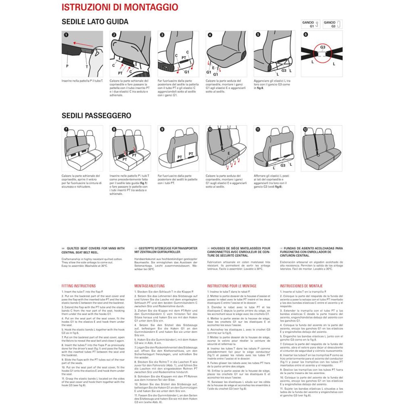 Coprisedili anteriori in poliestere trapuntato altamente resistente, per furgoni con cintura ad arrotolatore centrale sullo schienale lato passeggeri e seduta apribile. Compatibili con: CITROEN Jumpy <16, Jumper - FIAT Ducato, Scudo <16 - FORD Transit <19 - IVECO Daily 01> - MERCEDES Sprinter, Vito - NISSAN Trade - OPEL Movano 99>, Vivaro 14>19 - PEUGEOT Expert <16, Boxer - RENAULT Mascott, Master, Trafic - TOYOTA Hiace 8/95>, Proace <16 - VOLKSWAGEN Crafter 17>, Transporter (panca non apribile). Set composto da coprisedile anteriore lato guida + coprisedili anteriori lato passeggero (copri appoggiatesta disponibili su richiesta - cod. 001700104). Prodotti in Italia con tessuti italiani.