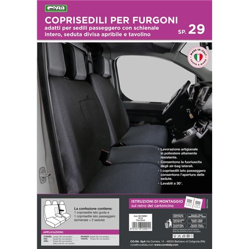 Coprisedili anteriori in poliestere altamente resistente, per furgoni con sedili passeggeri aventi schienale intero, seduta divisa e tavolino. Compatibili con: CITROEN Jumpy 16> con tavolino - OPEL Vivaro 19> con tavolino, Zafira Life 19> con tavolino - PEUGEOT Expert 16> con tavolino - TOYOTA Proace 16> con tavolino. Set composto da coprisedile anteriore lato guida + coprisedili anteriori lato passeggero (copri appoggiatesta disponibili su richiesta - cod. 001700104). I coprisedili lato passeggeri permettono l'apertura delle sedute e del tavolino. Consentono la fuoriuscita degli airbag laterali. Facili da montare e lavabili a 30°. Prodotti in Italia con tessuti italiani.