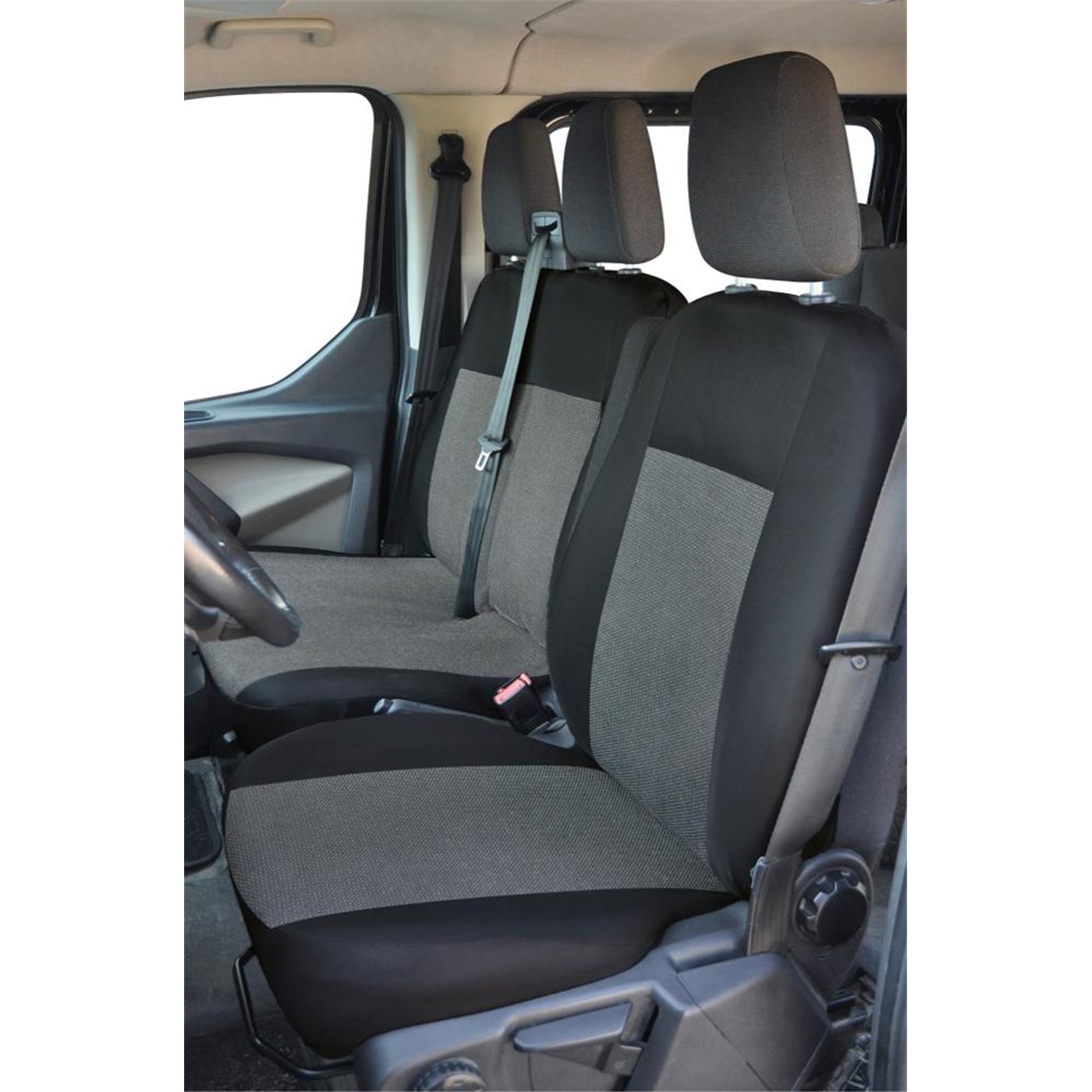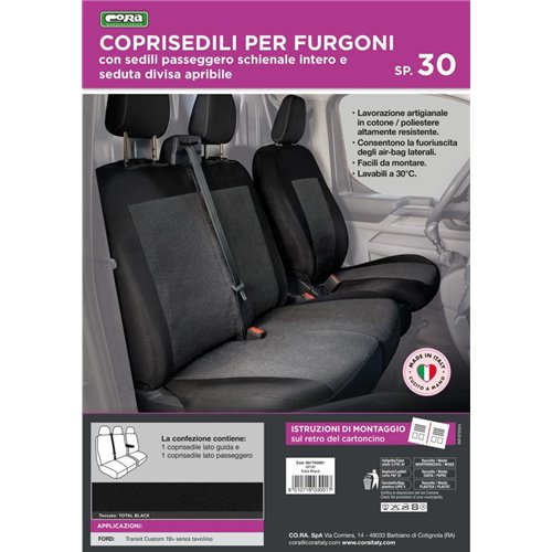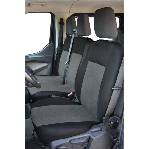 Coprisedili anteriori in poliestere altamente resistente, per furgoni con sedili passeggeri aventi schienale intero, seduta divisa e arrotolatore centrale cintura. Compatibili con: FORD Transit 19> senza tavolino. Set composto da coprisedile anteriore lato guida + coprisedili anteriori lato passeggero (copri appoggiatesta disponibili su richiesta - cod. 001700104). I coprisedili lato passeggeri permettono l'apertura delle sedute. Consentono la fuoriuscita degli airbag laterali. Facili da montare e lavabili a 30°. Prodotti in Italia con tessuti italiani.