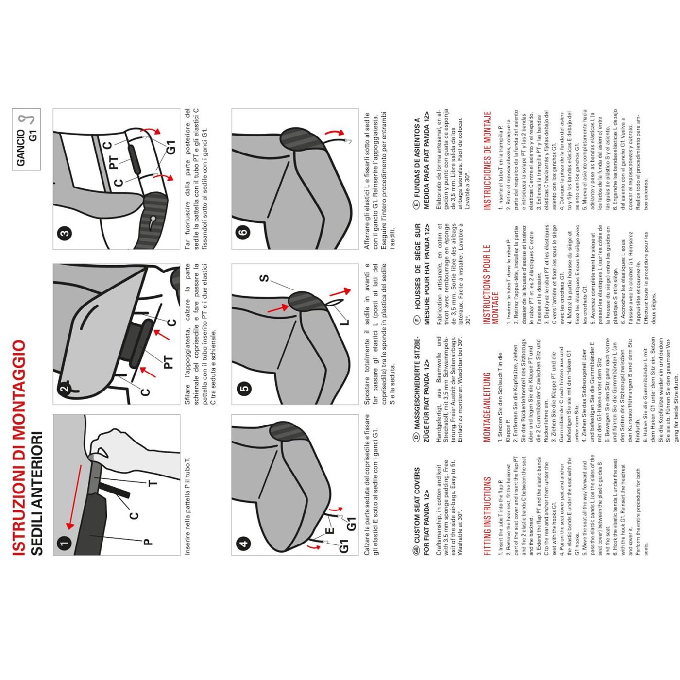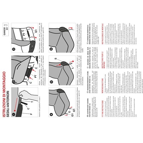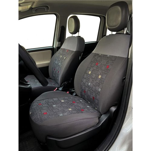 Coppia coprisedili anteriori realizzati su misura per Fiat Panda dal 2012. In cotone e maglino di alta qualità accoppiati con imbottitura di supporto in spugna (moltopren) da 3,5 mm. Facili da montare, consentono la fuoriuscita degli airbag laterali. Prodotti in Italia con tessuti italiani. Lavabili a 30°.