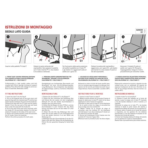 Coppia coprisedili anteriori per Volkswagen California/Multivan T6.1 19> e Multivan T7 22>. In cotone e maglino di alta qualità accoppiati con imbottitura in spugna da 3,5 mm. Consentono la fuoriuscita degli airbag laterali. Prodotti in Italia con tessuti italiani. Lavabili a 30°.