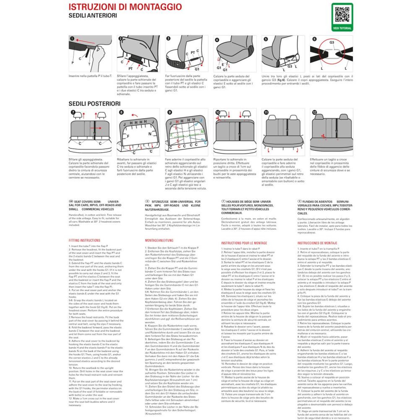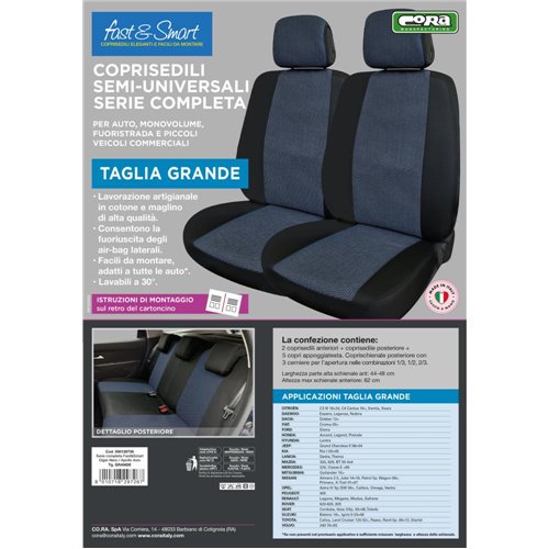 Serie completa coprisedili anteriori e posteriori in cotone e maglino di alta qualità accoppiati con imbottitura in spugna da 3,5 mm. Compatibili con tutti i sedili aventi lo schienale di altezza max 62 cm e la parte alta di larghezza 44-48 cm. Consentono la fuoriuscita degli airbag laterali. Coprisedili posteriori composti da: coprischienale provvisto di 3 cerniere (che consentono l'apertura nelle combinazioni 1/3, 1/2 e 2/3) e copriseduta intero. 5 copri appoggiatesta in dotazione. Prodotti in Italia con tessuti italiani. Facili da montare, lavabili a 30°.
