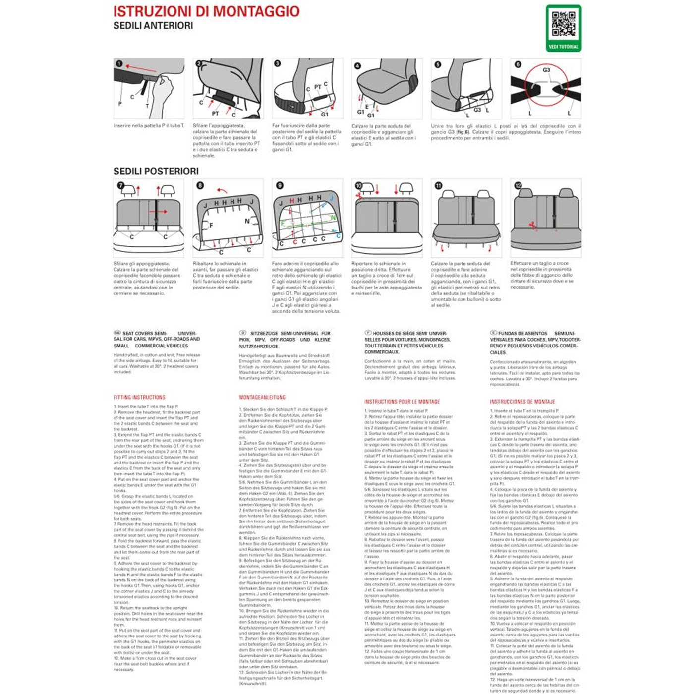 Serie completa coprisedili anteriori e posteriori in tessuto di alta qualità accoppiato con imbottitura in spugna da 3,5 mm. Compatibili con tutti i sedili aventi lo schienale di altezza max 62 cm e la parte alta di larghezza 44-48 cm. Consentono la fuoriuscita degli airbag laterali. Coprisedili posteriori composti da: coprischienale provvisto di 3 cerniere (che consentono l'apertura nelle combinazioni 1/3, 1/2 e 2/3) e copriseduta intero. 5 copri appoggiatesta in dotazione. Prodotti in Italia con tessuti italiani. Facili da montare, lavabili a 30°.