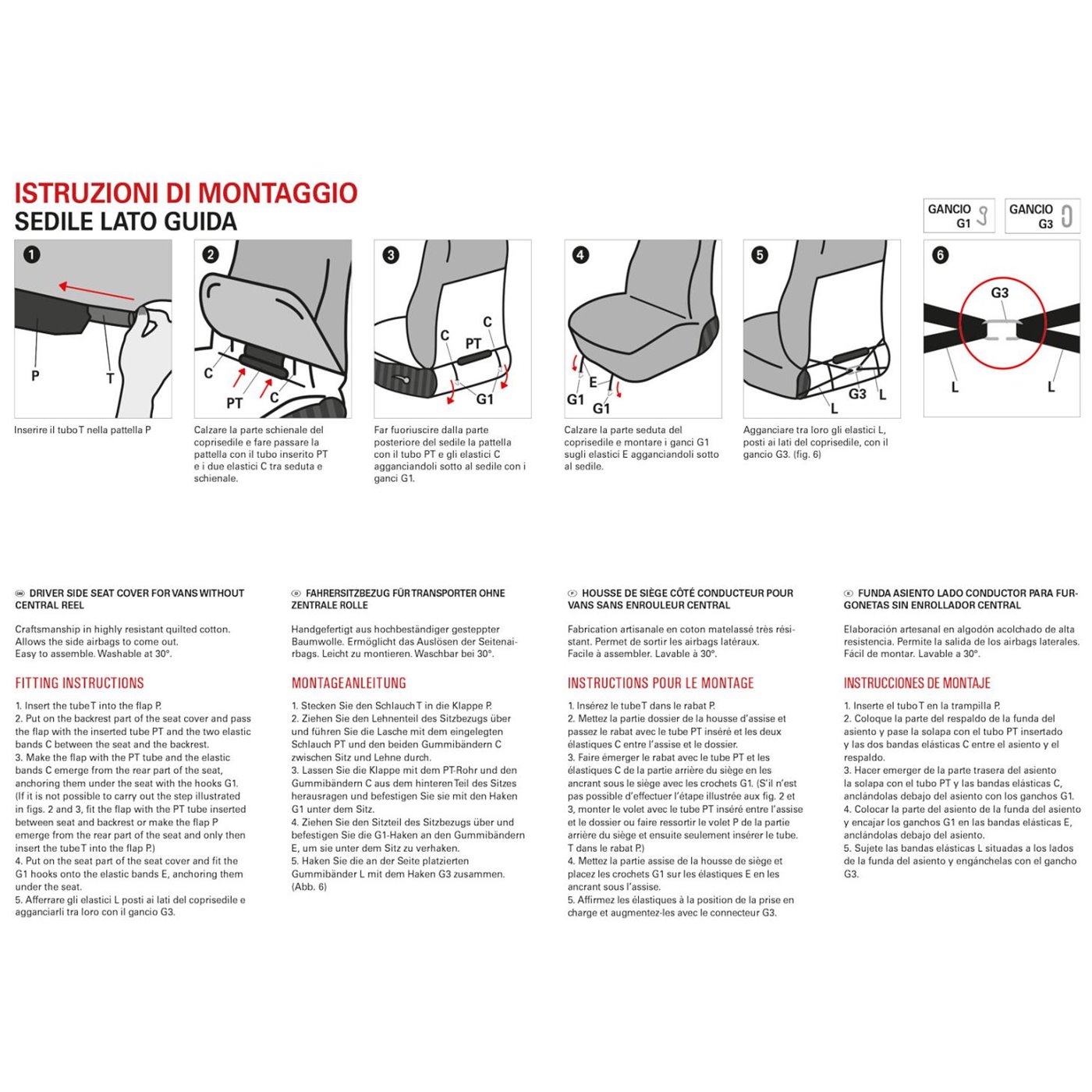 Coprisedile anteriore lato guida in poliestere trapuntato altamente resistente. Prodotto in Italia con tessuti italiani. Consente la fuoriuscita degli air-bag laterali. Compatibile con: CITROEN Jumpy >16 - FIAT Ducato 00>, Scudo 00> - FORD Transit >19- IVECO Daily 00> - MERCEDES Sprinter, Vito - NISSAN Trade - PEUGEOT Expert >16, Boxer - RENAULT Master, Trafic - VOLKSWAGEN Transporter.