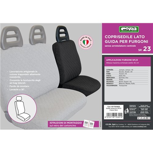 Coprisedile anteriore lato guida in cotone trapuntato di alta qualità. Prodotto in Italia con tessuti italiani. Consente la fuoriuscita degli air-bag laterali. Compatibile con: CITROEN Jumpy >16 - FIAT Ducato 00>, Scudo 00> - FORD Transit >19- IVECO Daily 00> - MERCEDES Sprinter, Vito - NISSAN Trade - PEUGEOT Expert >16, Boxer - RENAULT Master, Trafic - VOLKSWAGEN Transporter.