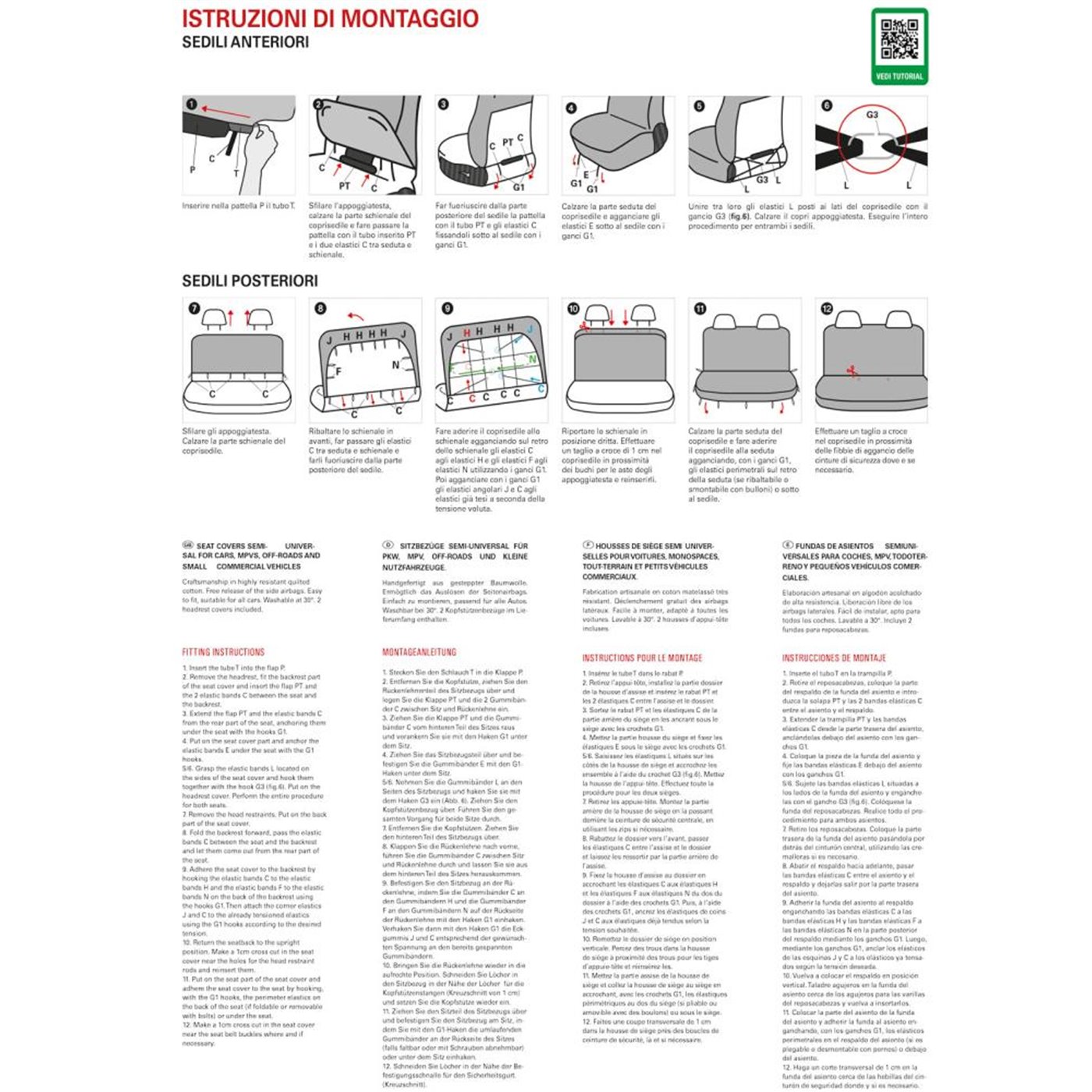 Serie completa coprisedili (anteriori+posteriore intero) in cotone trapuntato di alta qualità. Compatibili con tutti i sedili anteriori aventi lo schienale di altezza max 62 cm e la parte alta di larghezza 38-43 cm. Consentono la fuoriuscita degli air-bag laterali. Facili da montare, lavabili a 30°. Prodotti in Italia con tessuti italiani. 2 copri-appoggiatesta per sedili anteriori inclusi nella confezione, ulteriori copri-appoggiatesta disponibili su richiesta.