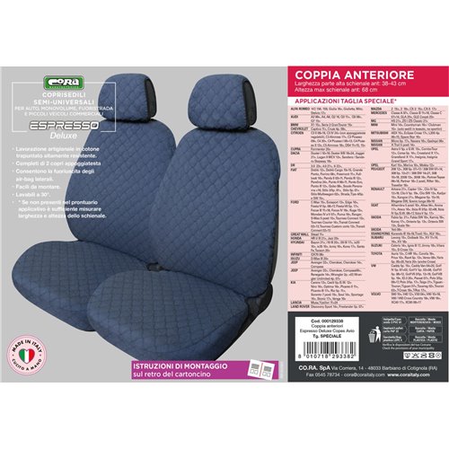 Coppia coprisedili anteriori in cotone trapuntato di alta qualità. Completi di copri appoggiatesta. Compatibili con tutti i sedili aventi lo schienale di altezza max 68 cm e la parte alta di larghezza 38-43 cm. Consentono la fuoriuscita degli air-bag laterali. Facili da montare, lavabili a 30°. Prodotti in Italia con tessuti italiani.