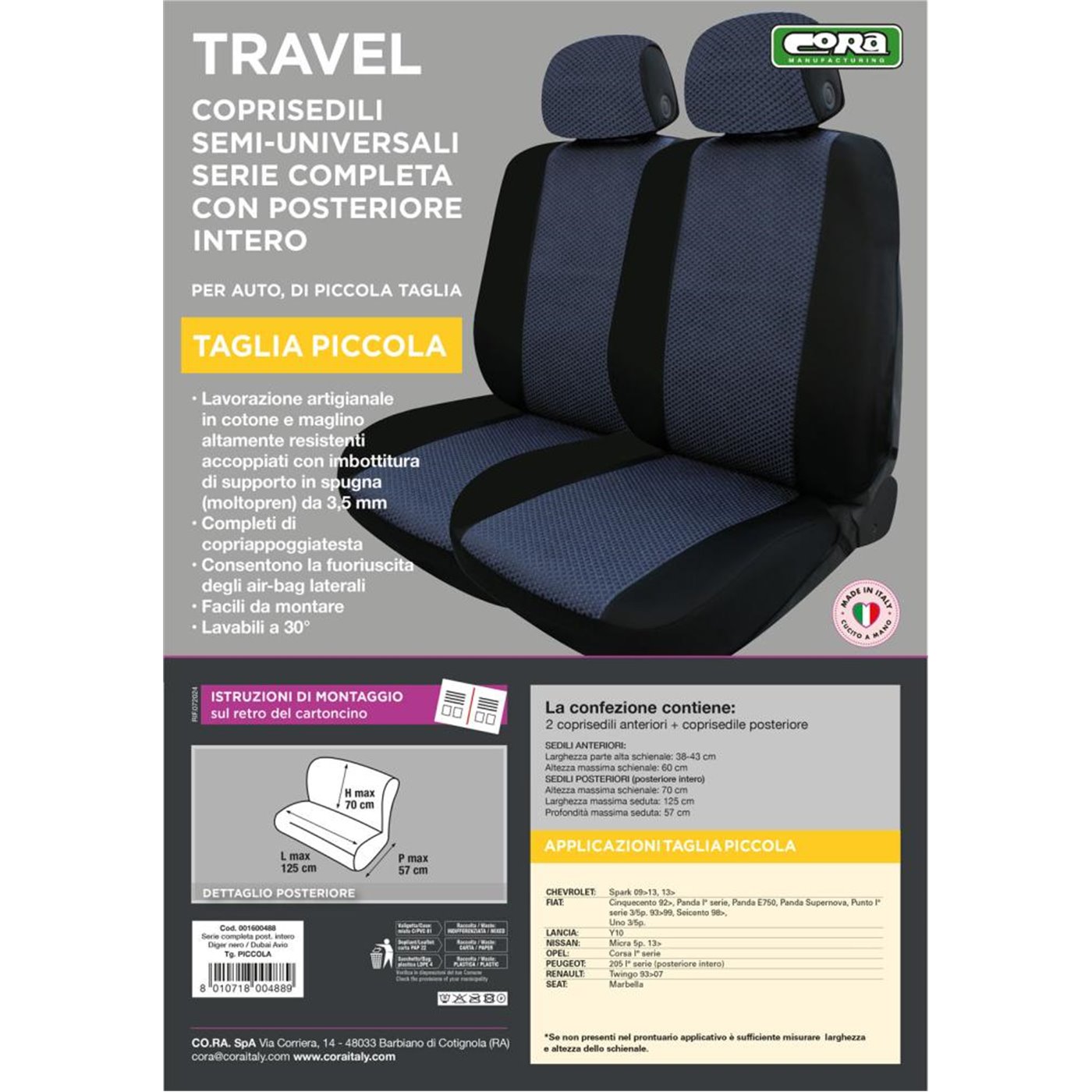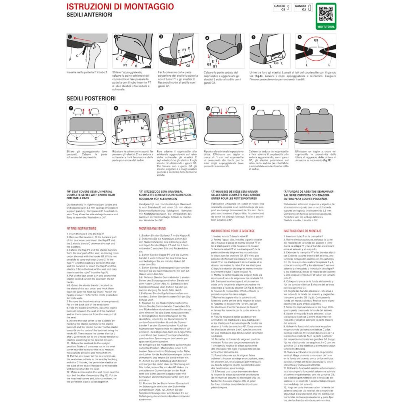 Serie completa coprisedili (anteriori+posteriore) semi-universali. Realizzati in cotone e maglino di alta qualità con imbottitura in spugna da 3,5 mm. Facili da montare, lavabili a 30°. Consentono la fuoriuscita degli air-bag laterali. Prodotti in Italia con tessuti italiani.