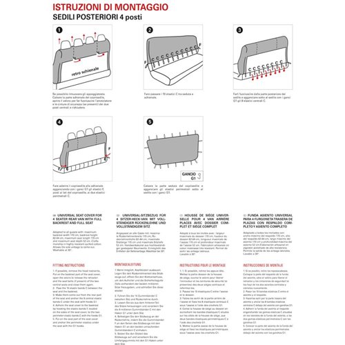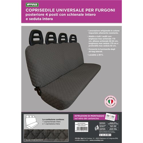 Coprisedile posteriore universale per furgone. Adatto a tutti i sedili posteriori a 4 posti con schienale e seduta interi (larghezza max schienale 170 cm, altezza schienale 62-64 cm, lunghezza max seduta 170 cm, profondità max seduta 52 cm). In cotone trapuntato di alta qualità. Prodotto in Italia con tessuti italiani.