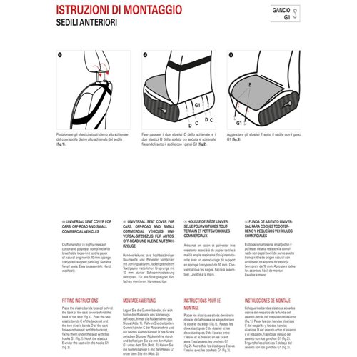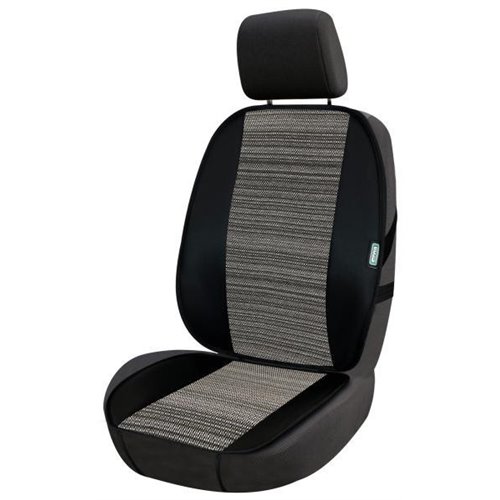 Coprisedile anteriore universale. Realizzato in cotone altamente resistente abbinato a carta tessile traspirante di origine naturale a maglia larga con imbottitura di sostegno in spugna (moltopren) di 10 mm. Adatto per tutte le stagioni ed in modo particolare in quella estiva in quanto realizzato con materie prime traspiranti di origine naturale. Facile da montare, si adatta a tutti i sedili di auto, fuoristrada e piccoli veicoli commerciali. Progettato in modo da consentire la fuoriuscita degli airbag laterali. Prodotto in Italia con tessuti italiani. Lavabile a mano.