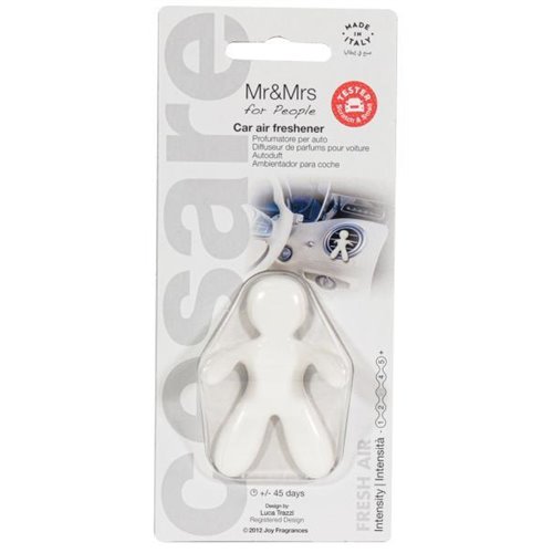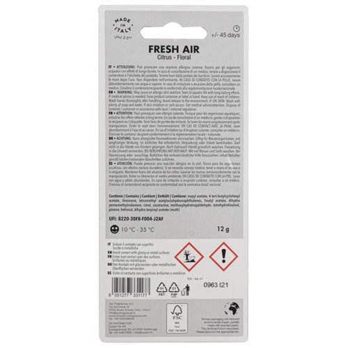 Profumatore per auto da agganciare alle bocchette dell'aria. Contiene una molecola aggressiva a lunga durata contro i cattivi odori (fino a 45 giorni di profumazione). Dimensioni 5 x 7 cm. Colore bianco. Fragranza fresh air.
