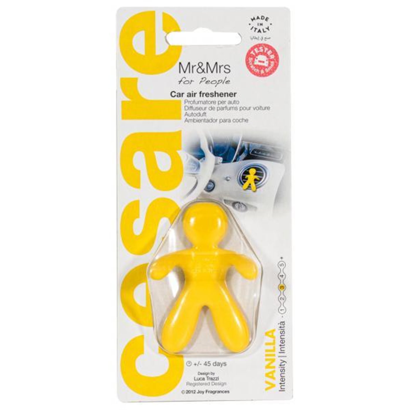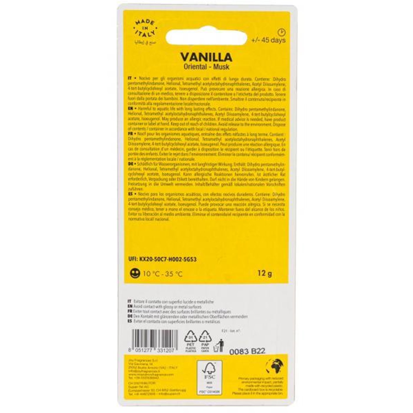 Profumatore per auto da agganciare alle bocchette dell'aria. Contiene una molecola aggressiva a lunga durata contro i cattivi odori (fino a 45 giorni di profumazione). Dimensioni 5 x 7 cm. Colore giallo. Fragranza vaniglia.