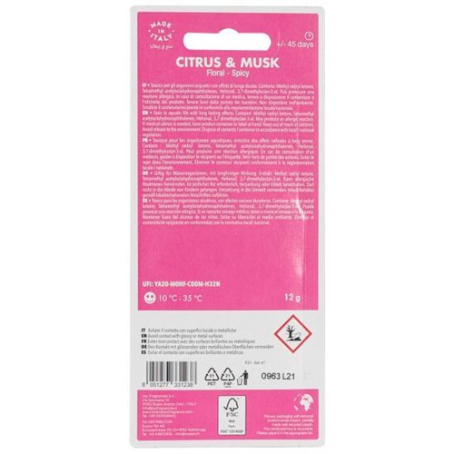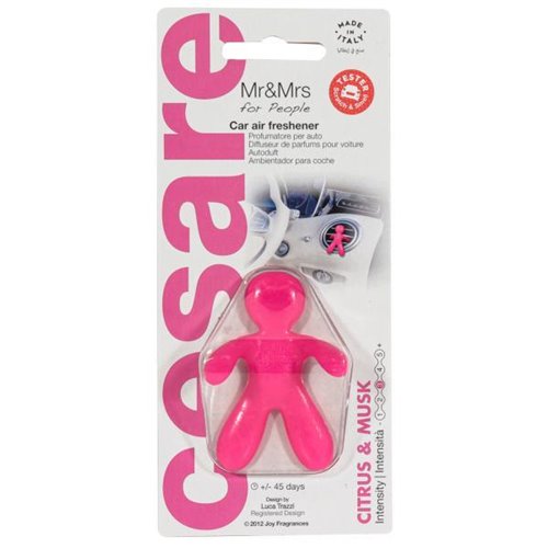 Profumatore per auto da agganciare alle bocchette dell'aria. Contiene una molecola aggressiva a lunga durata contro i cattivi odori (fino a 45 giorni di profumazione). Dimensioni 5 x 7 cm. Colore fuxia. Fragranza citrus & musk.