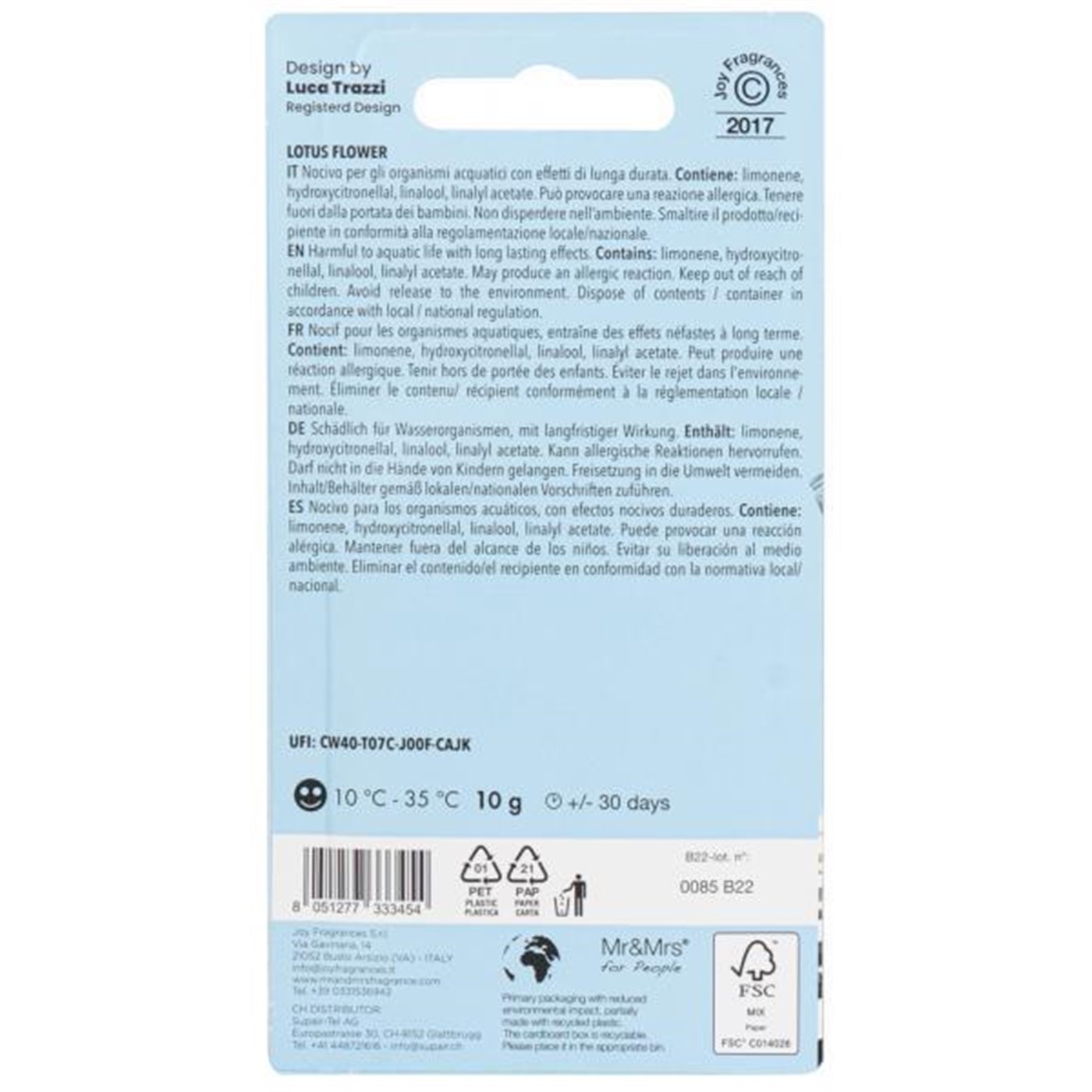 Profumatore per auto da agganciare alle bocchette dell'aria. Contiene una molecola aggressiva a lunga durata contro i cattivi odori. Fino a 30 giorni di profumazione. Dimensioni 4,5 x 5,5 cm. Colore azzurro cromato. Fragranza fiori di loto.