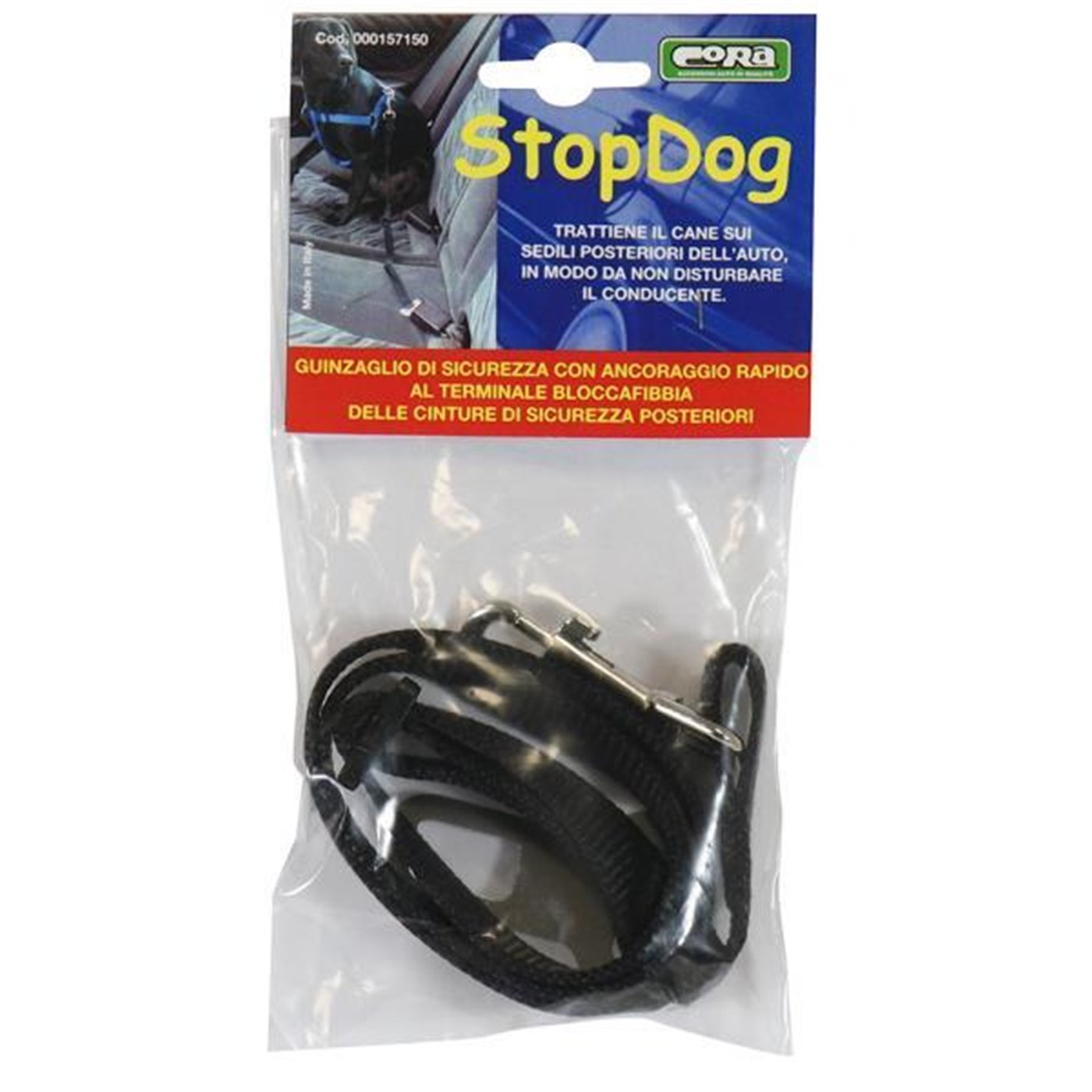 Guinzaglio regolabile che si inserisce con un clic nel terminale blocca fibbia delle cinture di sicurezza di qualsiasi mezzo e si aggancia alla pettorina del cane: in questo modo si impedisce all'animale di costituire impedimento o pericolo per chi guida, come previsto dal Codice della strada. Con Stop Dog è più comodo e veloce caricare il cane in auto per portarlo a passeggio anzichè montare o smontare un separatore. Realizzato con un robusto moschettone abbinato ad un nastro ad alta tenacità in nylon. Indicato per animali di peso non superiore a 25 kg.