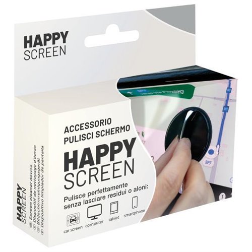 Pratico accessorio pulisci schermi ideale per display di auto, computer, tablet e smartphone. Costituito da un disco in microfibra che pulisce alla perfezione impronte e polvere senza lasciare aloni e residui, e da una base magnetica con biadesivo da attaccare al cruscotto per tenere sempre Happy Screen a portata di mano. Prodotto brevettato.