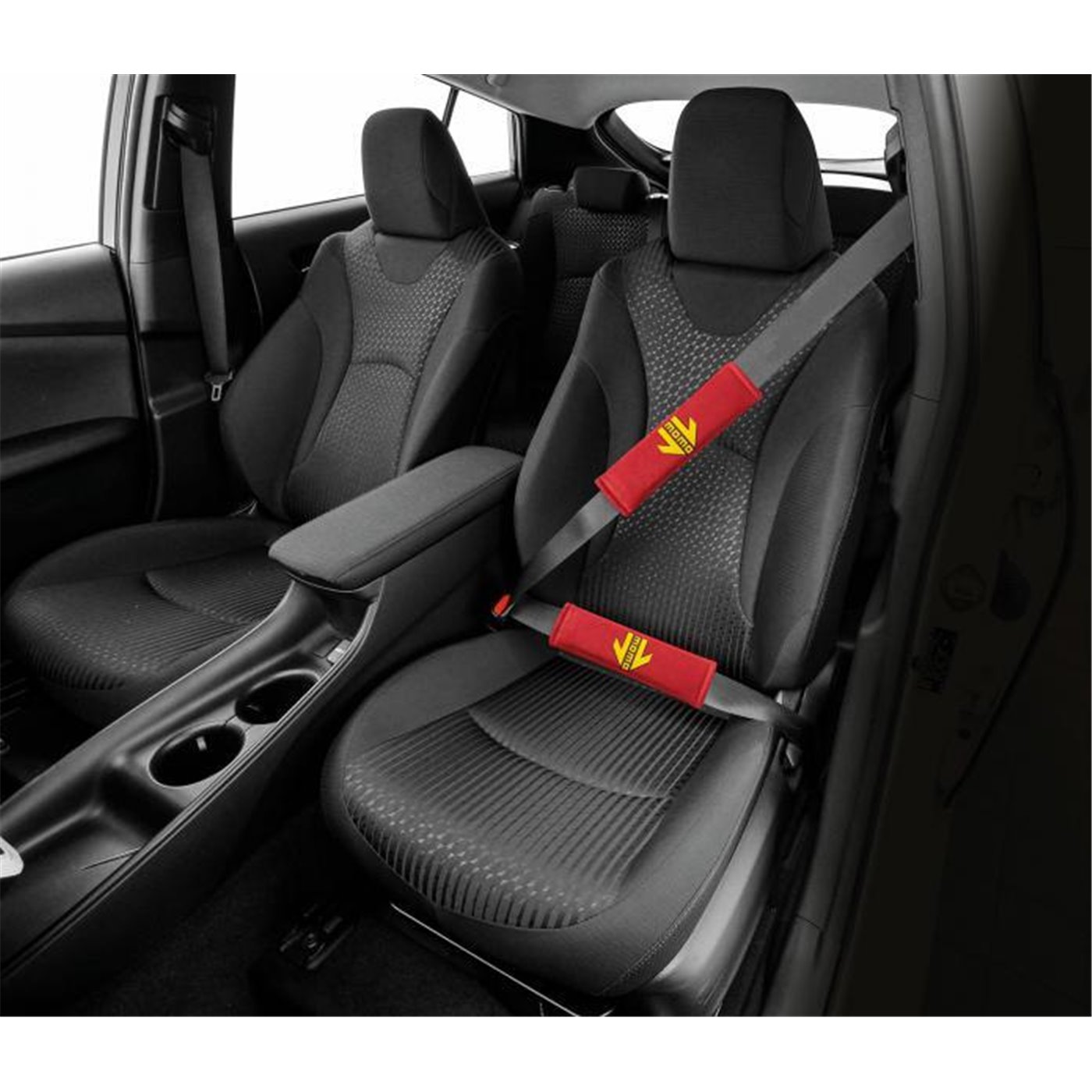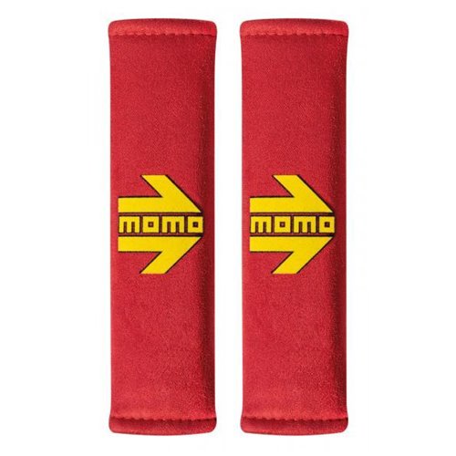 Coppia cuscinetti per cinture di sicurezza realizzati in micro suede. Colore rosso con logo MOMO giallo.