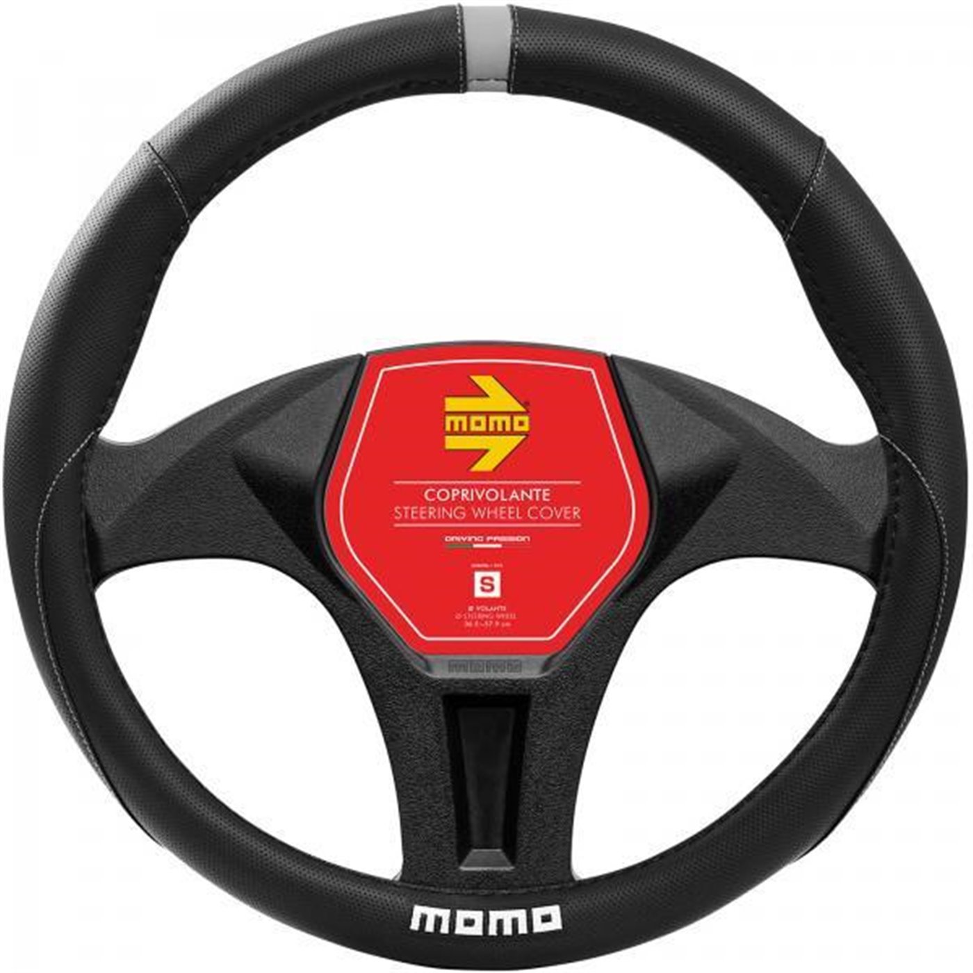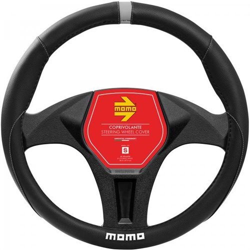 Coprivolante in morbido pvc traforato. Garantisce un'impugnatura perfetta contribuendo al miglior comfort di guida. Colore nero con inserto ore 12 e cuciture grigie e logo MOMO bianco. Per volanti di diametro 38-39 cm.
