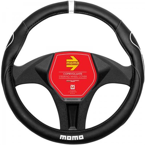 Coprivolante in morbido pvc traforato con inserti in rilievo. Garantisce un'impugnatura perfetta per il miglior comfort di guida. Colore nero con inserto ore 12, cuciture e logo MOMO bianchi. Per volanti di diametro 38-39 cm.