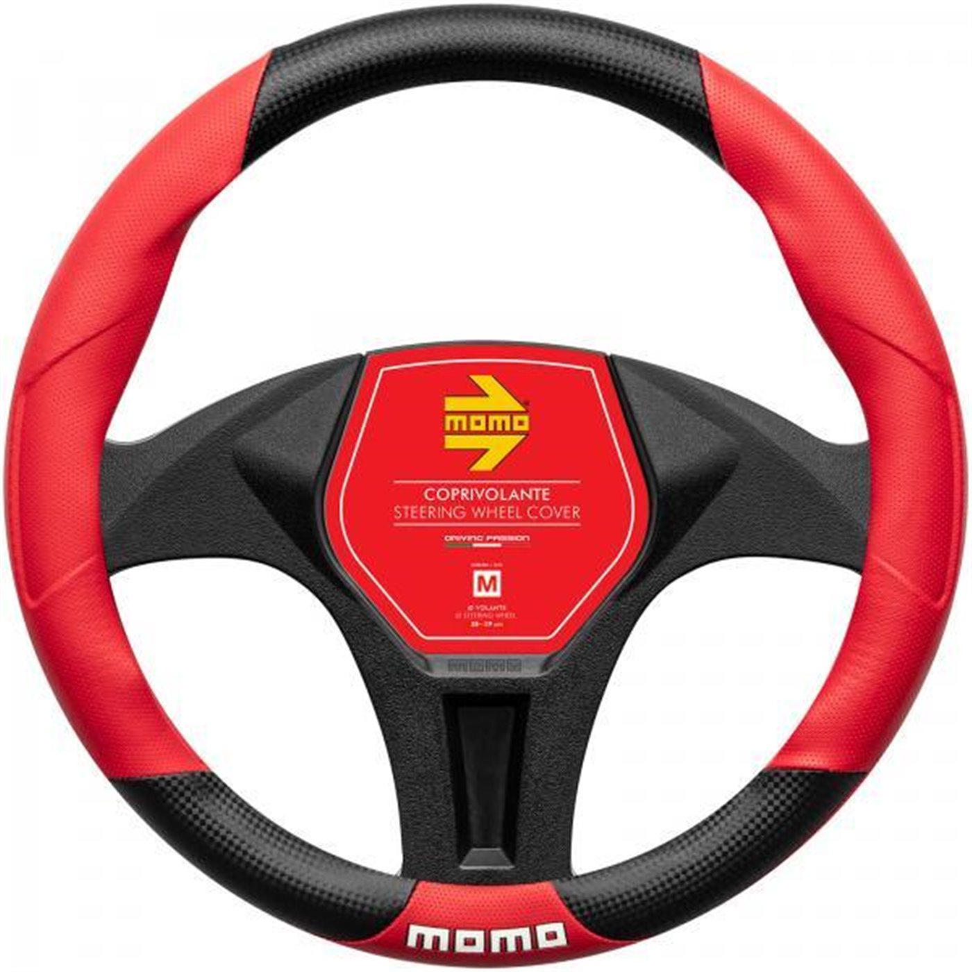 Coprivolante in morbido pvc. Garantisce un'impugnatura perfetta per il miglior comfort di guida. Colore rosso con inserti effetto carbonio e logo MOMO bianco. Per volanti di diametro 38-39 cm.