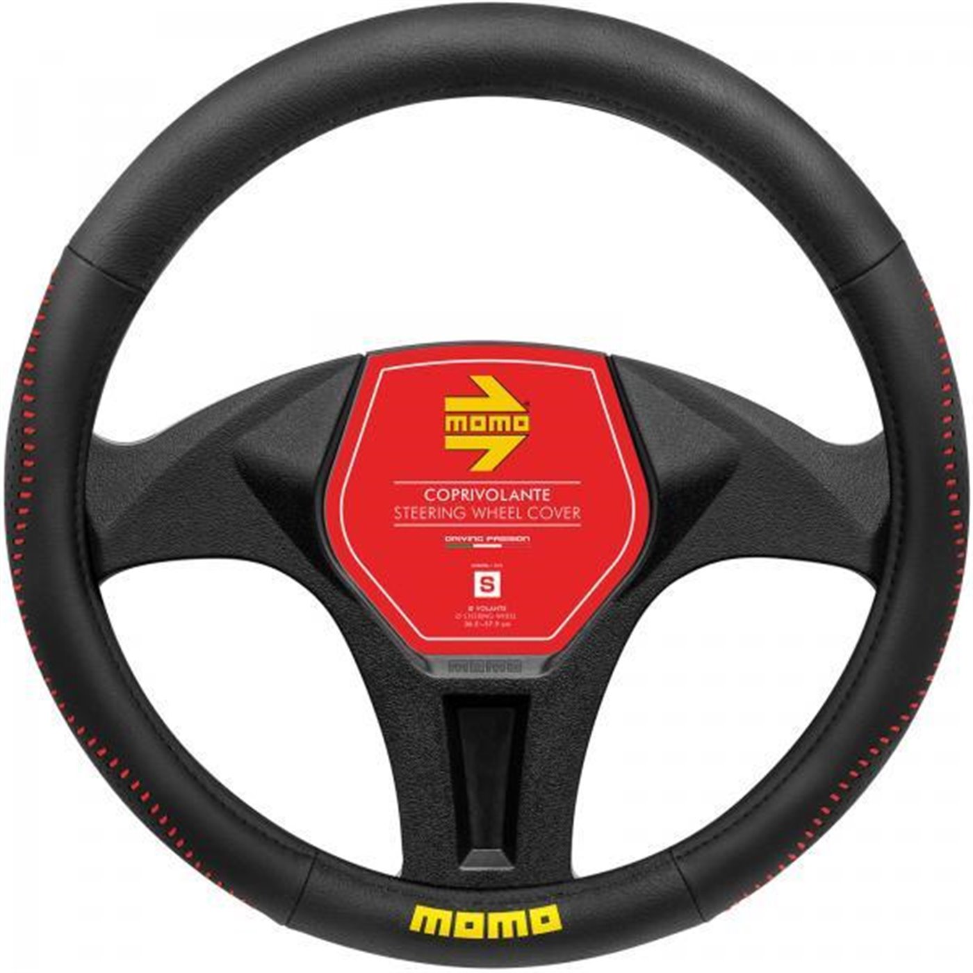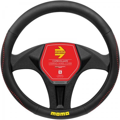 Coprivolante in morbido pvc. Garantisce un'impugnatura perfetta per il miglior comfort di guida. Colore nero con cuciture rosse e logo MOMO giallo. Per volanti di diametro 36,5-37,9 cm.