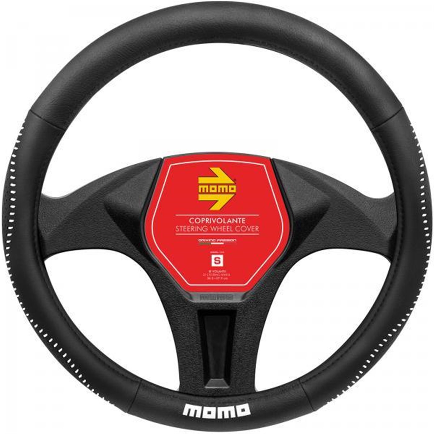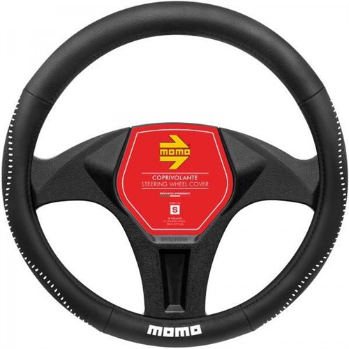 Coprivolante in morbido pvc. Garantisce un'impugnatura perfetta per il miglior comfort di guida. Colore nero con cuciture e logo MOMO bianchi. Per volanti di diametro 36,5-37,9 cm.