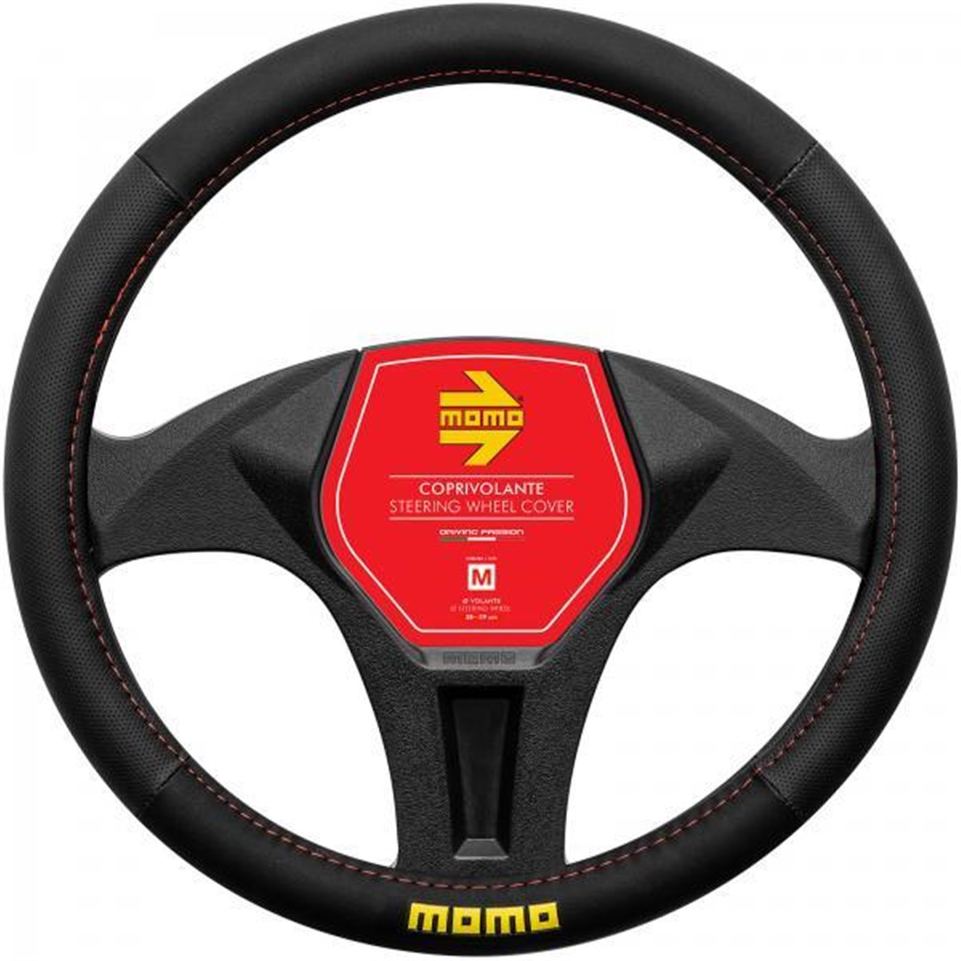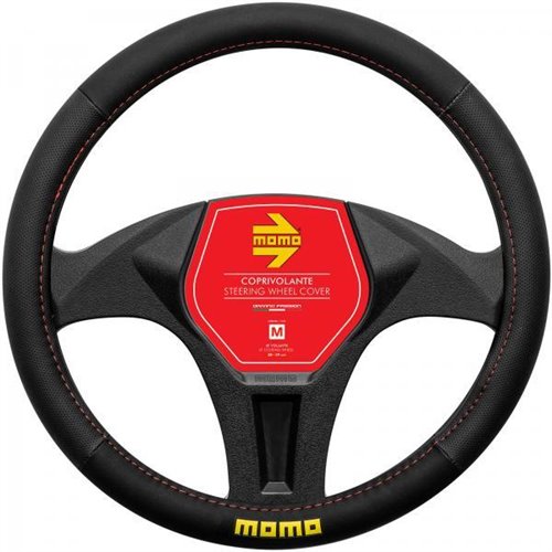Coprivolante in morbido pvc liscio con impugnature traforate. Garantisce un'impugnatura perfetta per il miglior comfort di guida. Colore nero con cuciture rosse e logo MOMO giallo. Per volanti di diametro 38-39 cm.