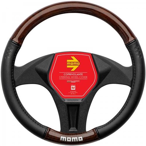 Coprivolante in morbido pvc. Garantisce un'impugnatura perfetta per il miglior comfort di guida. Colore nero con inserti in pvc effetto legno in radica lucida marrone e logo MOMO bianco. Per volanti di diametro 38-39 cm.